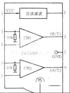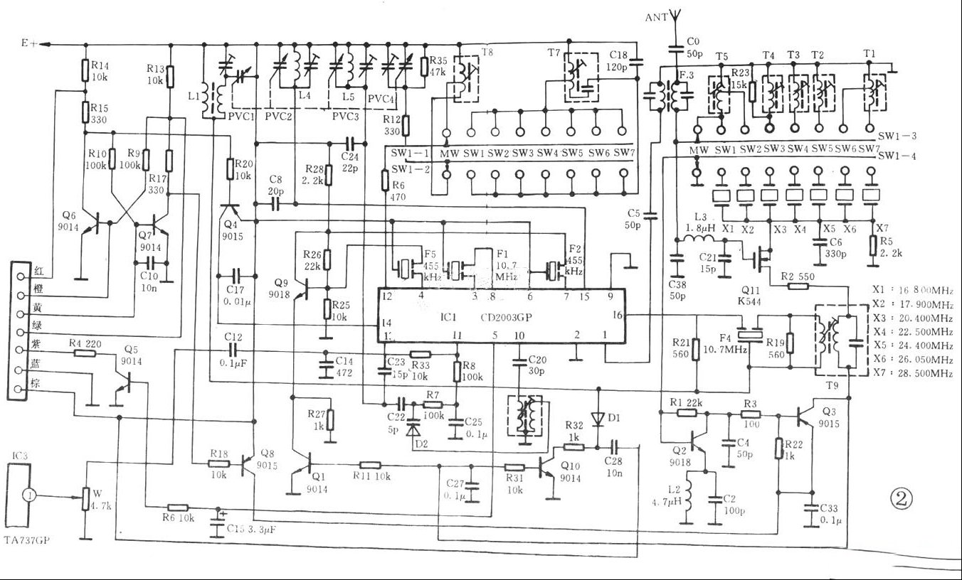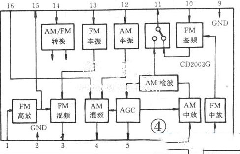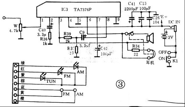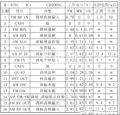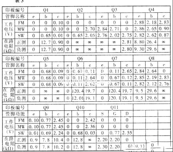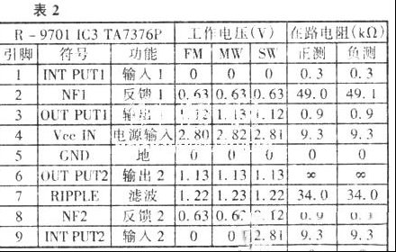 | 接收机的二次变频技木早先主要用于军事通信领域,以后逐渐用于民用通讯设备,如对讲机、移动电话、收信机等。国内将此技术移植于收音机中的德生公司第一家。第一代“短波王”R9700的推出,曾畅销大江南北,此后,又先后推出R9701、R9702等功能更优异,使用更方便的机型。 二次变频技术与传统的超外差式收音机的电路结构比较,见图1所示。 由上图可以看出,二次变频的应用,使收音机的接收灵敏度和选择性等指标大大提高。下面将承前启后的R9701机作一典型介绍。 上图2是德生R9701 AM/FM前级电路图,图3为其功放电路与操作功能显示电路。K1为电源开关。图2中的Q6、Q7等元件组成双稳态电子波段切换开关。由于开机瞬间,C10上的电压不能突变,Q7截止,电源电压E+通过R13、R9使Q6导通,其集电极上的低电平使Q4导通,IC1 14脚输入高电平,于是IC1工作在FM状态。与此同时,Q6集电极外接的FM LED点亮。 拉杆天线ANT接收到的高频信号经CO、F3、C5耦合至IC1①脚。IC1是一片低电压AM/FM收音机专用集成电路,内含AM/FM本振,混频及检波电路,内部结构如图4所示,引脚功能及实测数据如表1所示。 IC1①脚输入的FM信号经内部高频放大从15脚输出,再由PVC2、C8、L4选频后与PVC2同步调谐的本振信号(PvC3、L5、C24、IC1③脚内部元件组成)一起送入混频器。混频后从③脚输出的10.7MHz中频信号再经FM选频并送入IC1⑧脚,经内部中频放大,FM鉴频后通过电子开关选通,从11脚输出鉴频后的音频信号。TuN LED为电台强场指示灯(见图3)。 按动电子波段开关AM时,即相当于给Q6基极一个人为的低电平.Q6截止,FM LED熄灭。同时Q4也因高电平而截止,IC1工作在调幅波段。Q6集电极的高电平又使Q7由截止转为导通,AMLED点亮。由于Q7的导通,Q8导通,Q3截止。这时如果波段开关打在MW波段,SW波段的第一本振管Q2基极被信号短路,Q2截止。这时Q10、D1均截止。中波信号的接收与选频由Ll、PVC1等组成,并经R21送入IC1 16脚。与PvCl同步调谐的本振信号(PVC4、R35、R12、T8等元件组成)从IC1 12、16脚一起输入到混频器.得到455MHz中频信号从IC1 ④脚输出,再经F5、F2选频后从⑦脚输入。由于F5具有一定的插入损耗,信号经Q9作预放大。从⑦脚输入的455kHz中频信号经AM中频放大,检波后,再经电子开关选通从11脚输出检波后的音频信号。 如波段开关打在SW1~SW7任一位置,中波本振线圈T8被切断。拉杆天线ANT接收到的AM信号经C0、F3耦合至波段开关上与T1-T5等元件组成SW段带通滤波器。石英晶体X1~x7与Q2等元件组成SW段第一本振回路。Q2起振后,Q3导通,场效应管Q11得电工作。Q3导通后,Q10、Dl均导通,PVC1调谐回路被短路,可有效防止中波信号进入IC1。从天线接收AM高频信号和第一本振管Q2输出的本振信号一起送入混频级Q11。Q11在这里作混频管。其优点是输入阻抗高,噪声低,动态范围大,基本克服了接收机噪声大,易过载等缺点.还使整机的灵敏度、选择性大大提高。混频后的信号经R2、T9、F4选频得到10.7MHz中频宽带信号进入IC1的11脚。在F4的输出端并有阻尼电阻R21,其通频带≥500kHz,而且通带外衰减很大,它只允许10.7MHz±0.25MHz频带内的信号通过。SW1~SW7每个波段的频带均≤500kHz,因此可将每一个波段的不同信号变频到10.7MHz±0.25MHz范围内。 T7、C18、R35、PVC4、R12等元件组成第二本振回路。振荡信号IC1的12脚输入并与从ICl的16脚输入的第一中频信号一起送入混频器混频,得到的455kHz中频信号从④脚输出。T7为第二本振回路的本振线圈,改变PVC4中的容量可改变第二本振频率,因此可从带宽为500kHz的第一中频信号中找出某一电台频率,并将其变频为455kHz的第二中频信号。从IC1④脚输出的中频信号再经F5,F2选频后从IC1⑦脚输入。虽然本机短波采用了二次变频,但其灵敏度仍比中波接收效果要差一些。加之F5有一定的插入损耗,因此这里加有一级由Q9等元件组成的预放大电路。在SW接收过程中,由于Q2的起振,Q3导通,Ql随之导通。Q1的导通相当于将Q9的发射级直接接地,因此Q9的放大能力加强。从IC1⑦脚输入的中频信号经Ic内部中频放大,AM检波后,再由电子开关选通从11脚输出检波后的音频信号。由于SW波段的第一变频使用了石英晶体,因此第一中频频段就非常稳定。虽然第二次变频仍使用了LC回路,有微小的频偏,但这种频偏仍在其正常范围内,因此它不会产生逃台及飘移,可与PLL系统抗衡。 IC1的11脚输入的音频信号经R33、c12耦合.再由音量电位器w调控并送入音频功放集成电路IC3的1脚见图4。 TA7376P实际上是一片双声道功放集成电路,每声道可输出21mw的有效功率。本机由于没有立体声鉴频能力,故TA7376P设计成BTL工作模式,使得输出功率成倍增大。即使在使用耳机时,IC3仍为BTL工作仿式,两只耳机只不过串联而已,这便是本机唯一的缺憾。TA7376P内部结构如图5所示。引脚功能及实测数据如表2所示。本机各晶体管实测数据如表3所示。 |