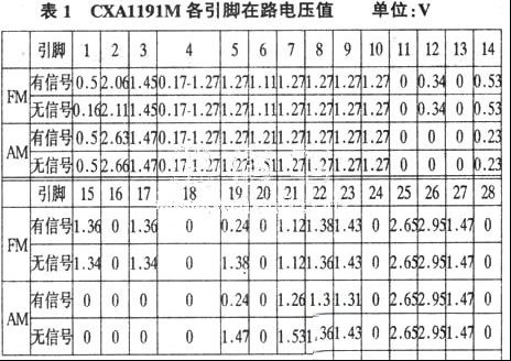 | 故障表现为:笔者收到故障机到这台德生R909T收音机,此机碰摔后AM收不到电台。波段切换指示正常,FM收音正常。 故障原因分析:测量CXA1191M的15脚电压,波段切换正常, FM收音也正常,说明集成电路正常。AM收不到电台应检查调幅中波的输入和振荡回路。检测天线无开路与虚焊。测CXA1191M的⑤脚电压为0V。断电在路测T3的各脚阻值,发现与⑤脚相接的一组不通,说明T3内部断线。打开T3外壳,重新焊好线圈。整机恢复正常。附上CXA1191M的正常工作电压实测值如表1,供参考。 备注: (1)、DT9205型数字表(20V挡)测得。 (2)、静噪开关打开,即①脚通过电容接地。 (3)、②③⑥、21、22、23脚的电压在不同信号时稍有上下波动。 |