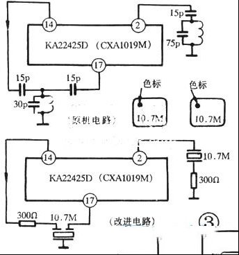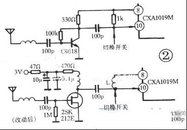 | CXA1019与CXA1191是早期日本索尼半导体公司出品的一款集成电路,它内部包含了组成调频/调幅(FM/AM)收音机所需的从高放、混频、中放、检波(鉴频)直至音量控制、功率放大的全部电路。CXA1191还含有调频无信号静噪功能。由于其集成度较高,功能齐伞,外围元件较少,国内有不少厂家采用此芯片生产便携式FM/AM收音机。本文接下来介绍几例收音机的检修经验,供广大网友维修参考。 一、串音问题 收到其他维修同行的一台ULTRA牌8波段收音机收听调幅广播时,有串音现象。在中波段,不管调在哪个频率,均有串入的“浙江人民广播电台”信号(在本地接收点,该台信号强度最大)。在短波段,由于信号相对弱些,虽无上述现象,但相邻频率电台信号的串音也比较严重。同时,该机调幅灵敏度也比较低。 该机的故障是选择性较差。选择性好坏最主要是由中频选频元件(中周)的特性决定。 参照图1检查变压器中周及陶瓷中周均完好,而且安装方向也正确(变压器中周的初级线圈阻值大于次级线圈,陶瓷中周外壳有标示端为输入端)。试将CXA1019 16脚外接的黄色陶瓷中周从印板上拆下,再将其输入端、输出端反个向后插入印板,焊好开机试听,上述现象消除,灵敏度也大增。在2.2k电阻上加焊470pF电容,再微调变压器中周后,灵敏度、选择性又有改善。此黄颜色外壳的陶瓷中周性能较差,是造成故障的原因,维修时将其拆下后反向安装是应急办法,当然换成名牌优质中周后,效果则更佳。如TDK品牌的中周,其特性比上述中周好得多。 二、收音机难收到信号 收到其他维修同行的一台ESE牌9波段收音机调频、短波信号较难收到,灵敏度较低。检查拉杆天线,感到天线座与天线的连接螺丝固定得不够紧。将其固定紧,使天线座与天线接触良好,收音效果有改善,但仍没有新机时那么好。将机壳打开,看到天线是靠一只套在天线座螺丝(用以将天线座与外壳固定)上的弹簧与线路板相接触而传递信号的,而此弹簧已锈蚀。看来此弹簧锈蚀造成接触电阻增大,引起故障。用导线将天线座与线路板直接焊接连通起来,故障机修到这里,终于修好值得探讨。。 本例故障较为常见。建议用户平时使用时,要经常将天线座与天线的连接螺丝固定紧,而机内弹簧也最好用导线代替,使机器保持较佳接收状态。 三、收电台噪声大 收到其他维修同行的一台SOLA牌8波段收音机,接收短波静态噪声偏大。排除了天线、转换开关的因素后,仔细分析电路:其短波调谐电路为单调谐电路,高频信号不调谐,是宽带输入,只靠改变本振频率完成信号选择。由于中周只能通过465KHz中心频率的中频信号,只要本振信号与高频输入信号有差频为465KHz的中频信号,中周就能将其选出,达到选台的目的。由于无输入调谐电路,为了提高增益,该机装有一级采用C9018高频三极管的短波高频预放。怀疑此三极管特性变差,使短波接收时噪声较大。更换一枚正品进口c9018管后,故障机修到这里,终于修好值得探讨。。 为进一步提高短波接收灵敏度、信噪比,还可采用具有低噪声系数、高输入阻抗、不易过载的2SK212E场效应管代替C9018管,改动前后的电路如图2所示。 四、啸叫问题 收到其他维修同行的一台WORLD牌10波段收音机,收听中波节目时,当信号较强或声音音量较大时,喇叭中会产生“呜呜”啸叫。 排除了电源、滤波、退耦等因素后,试着用耳机插入耳机插座,听中波节目。不管信号多强,音量多响,耳机中传出的声音均无啸叫、失真。怀疑线路板上有元件松动,会随喇叭震动而振动,使得原电路参数不稳定,引发啸叫失真。由于只有中波段有此现象,公用通道上元件的松动可排除。用酒精清洗波段开关,无效。中波段独用的本振线圈有可能松动,决定用蜡封固中波本振线圈。在中波段本振线圈屏蔽罩外壳上用烙铁加热,将蜡块(可用蜡烛代替)放在屏蔽罩的调节孔上面,使熔蜡渗进其内部。蜡液冷却凝固后,再开机试验,故障机修到这里,终于修好值得探讨。。 为防止机器摔、碰、震动而再引起故障。可在长波、短波1~7各波段的本振线圈或高放线圈的屏蔽罩内均熔入蜡固定。 五、阻塞问题 收到其他维修同行的一台WORLD牌10波段收音机收听调幅各波段,当信号较强或声音音量较大时,喇叭发出的声音时断时续有阻塞现象。收听调频波段时则无此故障。 电源、滤波、退耦等因素被排除后,调整音量电位器发现:收较强的信号时调小音量,声音仍有阻塞,收较弱的信号时,调大音量,声音也无阻塞,可见故障不在功放电路部分。收强信号有阻塞,收弱信号无阻塞是自动增益控制(AGC)电路故障特征。测量CXA1019各脚对地电阻,发现24脚检波输出端对地电阻仅一百多欧姆,仔细查看此引脚对地接的0.02uF音频滤波电容(兼有调频去加重作用),发现这片瓷片电容器侧面有一开裂小口,造成内部漏电严重。将其更换后,故障机修到这里,终于修好值得探讨。。该电容换作0.01~0.015uF,能使调频高频响应更佳。 CXA1019的29脚外接元件怎么会影响AGC呢?查看CXA1019内部电路资料,原来24脚除输出音频信号外,还有部分信号被送至22、23脚有关的调幅中放、检波、AGC电路。当0.02uF电容器漏电时,输入AGC电路的音频信号被衰减。接收强信号时,AGC电路无法控制调幅中放电路降低增益,造成输出音频信号阻塞。检修CXA1019S组成的收音机AGC故障,除检查23脚AFC、AGC滤波端,22脚、⑦脚AFC控制端外接阻容元件外,还要检查2