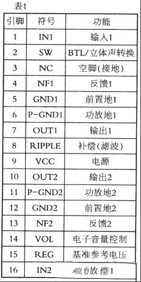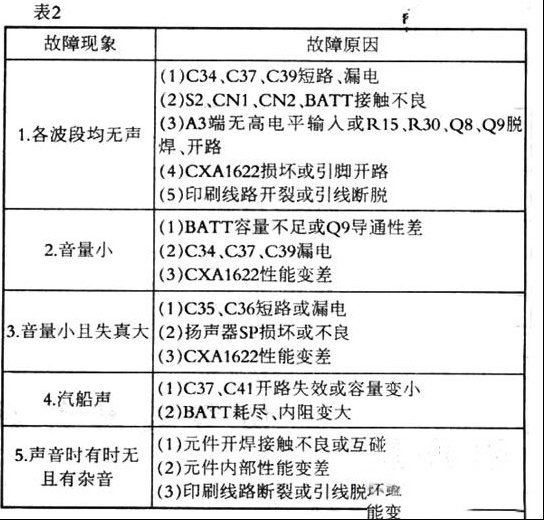 | 在德生系列收音机产品以中、高档收音机为主,品种很多,如8波段R-808A、10波段R-1010A、12波段R-9700、数字调谐PL737收音机等,几乎全部使用集成电路CXA1622作功率放大器(该功放电路在随身听及其他收音机中也得到广泛应用),本文介绍CXA1622的特性、工作原理及常见故障检修思路。 一、电路原理 以德生R-9700型收音机为例,CXA1622的内部结构框图及其组成的功放电路如下图所示。 CXA1622是一种性能优良的立体声音频功率放大器,内含双前置放大器和双功率放大器、BTL(单声道)/立体声(双声道)转换、电子音量控制等电路。它有两种封装:CXA1622P为十六脚双列直插式封装,CXA1622M为十六脚双列扁平封装。前者供电电压为1.8-7.0V,后者供电电压为1.8-4.5V,推荐工作电压Vcc=3V。技术手册给出的功率参数为:当Vcc=3V、RL=8Ω时,在BTL运用中,CXA1622P的输出功率Po=360mW,CXA1622M的Po=320mW:在立体声运用中,CXA1622P的Po=120mW×2,CXA1622M的Po=110mWx2。其各脚功能见表1。 如上图原理图所示,启动控制信号A3来自电子波段开关及开/关机控制集成电路74HC138(3线/8线译码器)的⑦脚(Y7)。闭合电源开关s2(亦可从CN1接入外部电源),按动轻触键ON/OFF后,A3输出的高电平使Q8、Q9相继导通,收音机得电工作。其中A7为电子波段开关的LED发光指示管供电,B1为收音电路(TA8122AN)供电。音频输入信号B2、B3来自收音电路TA8122AN的立体声输出端13、14脚,经C32、C33耦合后进入功放电路。C35、C36是负反馈电容,C41为左、右声道的频率补偿电容,放大后的音频信号由⑦、⑩脚输出。②脚是输出转换控制端,当立体声耳机插入CN2时⑦、⑩脚的中点电压经耳机、R27使Q1导通,②脚为低电平,此时CXA1622工作于双声道模式;当拔去立体声耳机时,Q1截止,CXA1622工作于BTL模式;使扬声器SP获得较大的驱动功率。 这样,比同样电源电压、同样负载条件下的OTL功放,声音要大得多。14、15脚为电子音量控制端,利用直流电压控制两声道分流电路的阻抗,即控制两放大器的增益,达到音量调整的目的。15脚输出1.3V基准电压,通过音量电位器W改变直流控制电压使两声道音量发生变化,不需要双联电位器。C42用于消除大音量输出时引起的电压不稳而产生的低频自激。 二、检修思路 上表2列出了功放电路常见故障及原因。接下来举几个检修实例,供广大网友参考。 1、开机后各波段均无声,但三个频段(AM、FM·TVl、TV2)指示管(D81~D83)转换发光正常。 分析与检修:此现象说明电子波段控制电路及电源供电基本正常。检查机内扬声器、外接立体声耳机与CN2接触均无问题。测CXA1622各脚电压及电阻,发现15脚电压仅0.1V(正常值1.3V),其正、反向电阻也仅为2Ω,取下滤波电容C34检查,发现已击穿短路,用一只10uF/25V电容更换后,试机,故障机修到这里,终于修好值得探讨。。 最后总结:W和R18对15脚输出的1.3V基准电压分压后供14脚进行音量调节,当15脚为0V时,14脚也为0V,这时电子音量控制器的衰减最大,故扬声器不发声。反之,若R18开焊、W接触不良或15、14脚连线短路时,14脚为1.3V,这时会造成音量最大并失控的故障。 2、BTL放音状态时扬声器声音小且失真,将立体声耳机插入CN2后,发现一个声道正常,另一声道声音小并失真。 分析与检修:从现象分析,立体声耳机及扬声器SP无问题。依次检查输入耦合电容C32、C33,负反馈电容C35、C36,消噪电容C38、C40,发现C36严重漏电,故障时测得CXA1622④脚电压及在路电阻分别为1.2V和36k(正常时应为2.3V、无穷大)。更换C36后④脚电压、电阻恢复正常,故障机修到这里,终于修好值得探讨。。 最后总结:在实际检修中,因负反馈电容C35、C36击穿漏电而引起的失真故障并不多见,扬声器SP(如纸盆破裂、音圈与磁隙间有杂物)或耳机不良及CXAl622内部电路存在故障,导致的 发音失真却比较多见。 3、各波段收音均正常,但扬声器中夹杂有较响亮的“嘟嘟”啸叫声及“噗噗”的汽船声,并且杂音不受音量调节电位器控制。 分析与检修:由于杂音不受音量电位器控制,因此可以判断故障出在电源或功放电路。从CN1输入外部4.5V电压及换上新电池试验,故障依旧,说明不是电池BATT内阻变大引起的自激故障。用万用表直流电流挡在电源开关S2上测整机电流,正常值约15-20mA,实测值在无杂音时为50mA,有杂音时超过100mA,说明电源滤波电容或印刷线路板受潮漏电。检查发现C37严重漏电,取下测量其两端阻值不足300k,且容量从470uF下降到28uF。更换C37后“嘟嘟”声基本消除,但还有“噗噗”的汽船声存在。继续检查左、右声道频率补偿电容C41,发现其容量减小(可能因内部电解液干涸引起的),已从原来的10uF变为6.2uF。更换C41后,故障彻底排除。 最后总结:功放级产生低频或高频自激是较常见的故障,其原因除了BATT容量不足(内阻增加)、电源滤波电容C37、C39容量减小或开路失效及频率补偿电容C41失效外,(也可能是CXA1622不良引起的。另外,在较大音量情况下用立体声耳机收听出现低频自激时,应注意检查C42有无开路或失效。 |