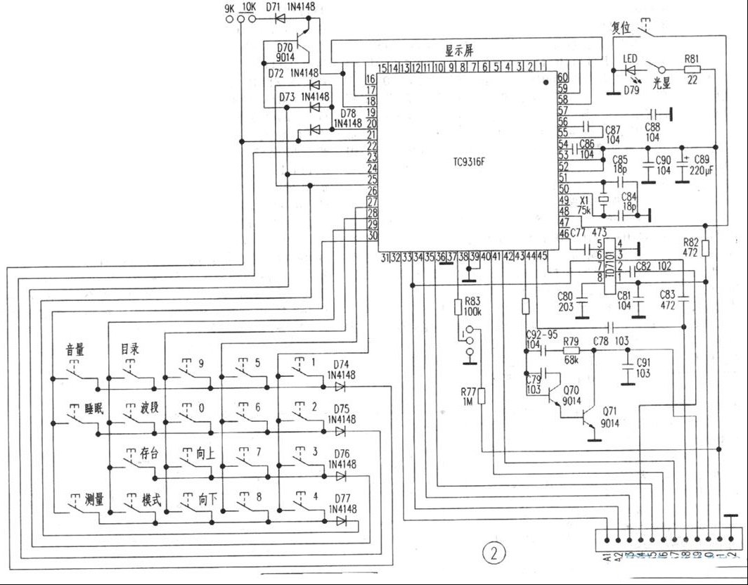 | 德生牌PL757A型全波段立体声钟控收音机是比较实用的袖珍收音机。本文介绍该类机型的常见故障检修及电路资料(整机电路如下图1所示,键控显示电路如下图2所示),供广大网友参考。 1、装入电池开启电源,显示窗“换电池”字符不停闪烁,此时换上一套新电池仍旧如此,说明问题不在电池,是电源供电系统出现毛病。根据图1所示,电源供电输入端接入的稳压二极管ZD1(8.2V/1W)是防止供电电压过高而设置的保护元件,属易损件。打开机壳首先用万用表电阻挡测ZD1两端电阻值很小,很可能ZD1已击穿。取下该管进一步检测,确认已击穿。因该管已看不出是什么型号,于是按图上标明的8.2V/1W要求购买装上,再测ZD1两端在路电阻,表针逐步上升至10k左右,表示供电输入端短路现象已排除。通电开机,一切功能恢复正常。 2、另收到其他维修同行的一台PL757电源能开启,但显示提醒电池不足更换电池,此时手摸电池外表,很热,表明耗电很大。赶紧关机,打开检查,先测ZD1两端正反向电阻约3k,与正常状态有差异。用户反映此机检修不久,使用几天就更换了多套电池,当时修理人员因没有该机图纸,更换了一个小元件应急代用,换后能收音了,但却发生了此故障。于是首先检查电路板上电源控制电路,发现ZD1已更换过,取下代用的ZD1二极管测量,其正向电阻6k,反向电阻40k(正常应为无穷大)。说明所代用二极管性能不符,参考图1焊上一只8.2V/1W(1N4738A)稳压管后故障机修到这里,终于修好值得探讨。。 除了上述两例ZD1易损外,电源控制电路Q23、Q24和低压稳压块LM2931损坏比较常见。另外使用中接插不注意,易造成外部DC供电JACK插孔接触不良。或者因接片氧化锈蚀,导致内外加不上电;电池正负极片变形、腐蚀导致接触不良等也常见。 最后要指出的是,该机有一种不属故障的“死机”状态,即在更换电池或转换外接电源时,操作有误,或者收音机遭遇强烈干扰时(如雷电),机内的徽电脑芯片可能会进入内部死循环状态,不接收外部指令,这样就出现了“死机”现象。主要表现为没有屏显,按电源开关不能开机;或显示屏有显示,但按键不起作用;或开机后可以正常收听电台节目,但不能关机等不正常状态,这时可利用该机电池仓内下部一个专为排除“死机”状态设置的保护功能键——“恢复键”,轻轻点压一下该按键,即达到恢复状态。 |