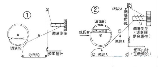 | 指针式收音机的调谐拉线一旦被拉断将很难迅速修复。尤其是在没有拉线绕制图的情况下,要重新绕制拉线更是一件令人头痛的事。笔者为此绘制了德生R909多波段收音机的拉线绕制图(见附图),供大家在维修时参考。为便于查看绕线路径,图中所示拉线是处于松弛状态。 收音机的调谐拉线一旦拉断就应换用新线重新绕制,因为拉线不允许中间有接头,否则会在运行过程中发生卡阻。重新绕制时应截取一段略长于原拉线的尼龙线作为新线,新线不能太细,否则不但因强度不够容易造成再次拉断,而且摩擦力也达不到要求,造成调谐过程中打滑。绕制时应先将新线的两头系在拉簧的外侧眼圈里,但不要系得过紧,以便调整,然后就可以按图绕制了。绕好之后整个拉线系统应处于一定的绷紧状态,松紧度以转动调谐轮能顺畅带动四联电容的中轴转动为宜。拉线不能过紧,否则会造成调谐费力且容易再次将拉线拉断,甚至将导向轮拉脱。如果绕好的拉线略有调谐打滑现象,可通过在拉线上涂抹一些松香粉的方法来加以解决。最后将调谐指针装上,并通过开机收听某一频率电台的节目来调整指针所指频率的刻度,以使指针所指频率与实际收听电台的频率相一致。 另外.其他品牌型号的多波段袖珍收音机的拉线绕制图与德生R909基本上一致。可参考维修。 另外有其他笔者对上面的文章内容里面绕制方法提出异议,具体如下: 上文的调谐拉线的绕制方向有待商榷,以免误导收音机修理初学者。 下面将原图(调谐拉线绕制图)重画于图1。按照上文的拉线绕制方向来看,频率指针所处的位置,应该是电台频率信号的低频率段,因为本机安装的频率刻度盘字面是从上往下,频率越来越低,即数宁由大到小的排列。如果按照《收》文的调谐拉线绕制方向绕制拉线,那么将会出现以下两条不冶之症。 第一是绕在调谐拉线旋钮轴上的拉线将会绞合在一起,不能正常调谐。并非像上文所说“调谐轮能顺畅带动四联可变电容器的中轴转动”。 第二是当频率指针上移到频率刻度盘的上半部时,频率指针将会被调谐旋钮轴阻挡住,不能前进。真正像上文所说“会在运行过程中发生卡阻”,动弹不得。因为固定在拉线上的频率指针根部与调谐拉线旋钮轴相撞卡阻,频率指针还受拉线下降下拉力的作用,将使指针顶部顶撞到收音机前外壳的内表面被卡,也难移动。万一到了这个地步,实在是进退两难。 以上两点是笔者按照上文介绍的调谐拉线绕制图的绕制方向,在德生牌R-909型多波段收音机上实践得到的结论。 下面是德生牌R-909型调频/中波/短波全波段收音机的正确调谐拉线绕制示意,如图2所示。线B段应在线A段的下面,线B’段应在线A’段的下面,频率指针(现在)所处的位置是在低频段范围上;调谐旋钮轴上的拉线圈数以绕3圈为佳(出厂原机即绕3圈)。 通过实验:如果绕上2圈或1圈,调谐拉线将在调谐轴上产生打滑现象,不能顺利调台;如果绕上4圈或4圈以上,那么严重后果将会是调谐拉线上溢,发生绞合现象,更加不能顺利调台,真是寸步难行。 |