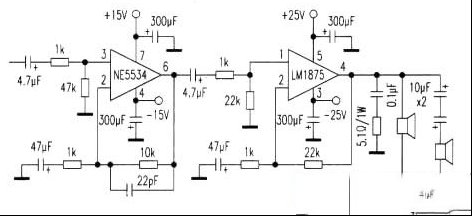 | LM1875是美国国家半导体公司出品的5脚单列V型直插塑封IC,为高保真音频功率放大集成电路,主要技术指标:频响范围:20Hz-20kHz;负载阻抗:8/4欧姆;失真率:40W输出时0.05%;电压范围:20-60V。 NE5534是专为音频放大而设计的运算放大器,用于音响前置放大电路。 制作中注意LM 1875供电端(5脚)的滤波电容不可省掉,且距离LM1875的管脚越近越好。其作用是防止LM1875产生自激。LM1875还需要加装散热片。 |