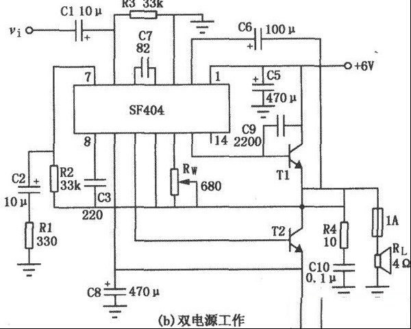 | SF404音频功放集成电路:双列14脚封装;静态电流=60mA;输出噪声=2mV;输出功率=6W;输入阻抗=50kΩ;闭环增益=40dB;谐波失真=1.5%;开环增益=70dB。SF404具有保真度高、驱动能力强、热稳定性好、电源电压适应范围宽、使用可靠等优点,在直流、交流、瞬变特性方面的性能都很好,而且外围元件连接灵活多变,能接成多种应用电路,如图所示。图(a)和图(b)所示电路为用SF404接成OCL和OTL功放应用电路。 |