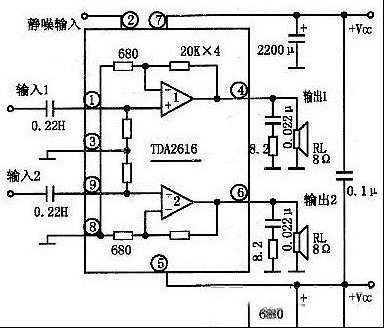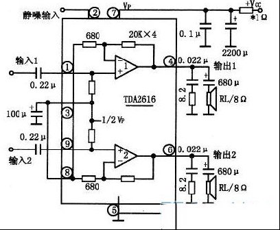 | TDA2616双声道音频功率放大芯片,它既可以采用双电源供电也可以采用单电源供电,TDA2616本身特性较好,如条件许可应首选双电源供电以提高听音质量。TDA2616的工作电源电压范围是±7.5V~21V。在±16V,THD=0.5%时,输出功率为2×12W。 1、TDA2616引脚功能 2、TDA2616双电源接法电路 3、TDA2616单电源接法电路 |