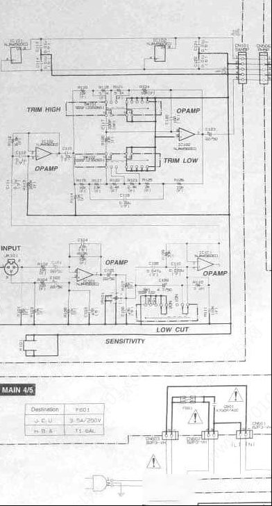 | 收到其他维修同行的一台YAMAHA雅马哈MSP10是两分频有源监听音箱,音箱内置电子分频,高低音双功放,卡侬输入口,音箱有一状态指示灯,正常绿色,故障红色。一只故障MSP10故障,开机后指示灯红灯亮,细听音箱内扬声器保护继电器不吸合。打开后背功放外壳,可以看到有三块电路板,分别是输入板(MAIN 1/5)、驱动板(MAIN2/5)、功放板(MAIN3/5)。开机,测量功放输出对地电压,发觉高音功放输出不为零,低音功放输出正常,说明高音部分电路有故障,静态输出电压不为零,扬声器保护电路起作用,继电器不吸合。把驱动板与功放板相连的连接器CN609拔开,开机,听到继电器吸合声,用万用表测量高音功放输出端对地电压,电压为零,但音箱前面的指示灯依然红色,说明故障在驱动板。目测驱动板元器件,没有发现异常。用指针万用表电阻档测量驱动板高音放大部分二极管、三体管基极与另外两极,有明显PN结特性,由于高音发大与低音放大部分电路结构一致,对照测量低音放大部分晶体管,情况一致,说明晶体管未损坏。故障可能出在电容击穿或电阻问题,由于高低音两部分发大电路基本一致,对照两部分用万用表电阻档测量电容和电阻阻值;发现高音驱动电路驱动管Q418的上偏置电阻R415开路,更换47K电阻,恢复正常。 本次维修分析: 1、此有源音箱状态指示灯采集的是驱动板状态,扬声器保护继电器电路采集点为功放输出端,通过指示灯和保护继电器是否吸合可大致判定故障位置,设计非常妙。 2、OCL电路直连,互相牵扯,牵一发动全身,所以合理分割电路可有效确定故障大致位置,本案拔开驱动板与功放板的连接,确定了故障在驱动板。 3、高低音驱动电路基本一致,对照阻值检查对判定故障点带来很大便利。 4、R415是高音驱动电路负半周驱动管Q418的上偏置电阻,电阻开路后,破坏了电路平衡,导致指示灯红色告警,输出静态对地电压升高,扬声器保护电路起作用,继电器不吸合。 |