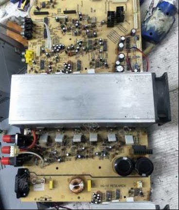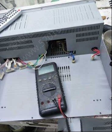 | 收到同行送来的故障机壹台惠威AV-638功放,此机开机能听到继电器吸合声,自检十几秒后就自动跳E01代码,在没接信号输入输出时都是一样的,继电器吸合时主供电正常,(此机只在副电源板上有一个继电器,主功放板上没有)测功放管BE极无偏置电压,中点电压没有,管子没击穿。最后查出是保护芯片1237的第一脚上的一个三极管5401击穿,此脚是功率输出保护脚,更换三极管5401后故障修复。 |