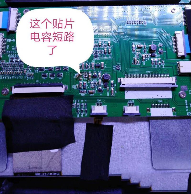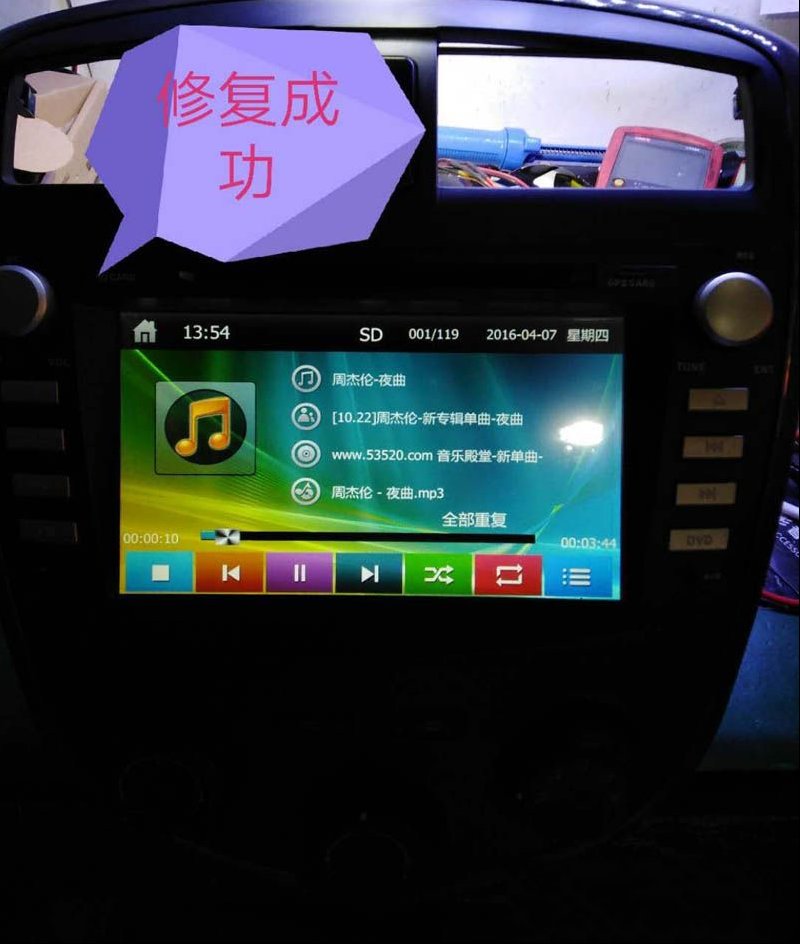 | 收到同行送来的故障机壹台海马普力马车载导航,试机屏幕一半白屏一半花屏,声音正常,如下图所示。第一印象判断是屏幕问题,用同规格屏换后故障一样。主板到显示板各排线无松动。检查显示屏供电电压VDD,VCOM正常。VGH正7V偏低。VGL负OV不正常。查VGL滤波电容短路,换后VGL负7V左右。VGH恢复到正10V,试机图像正常。 |