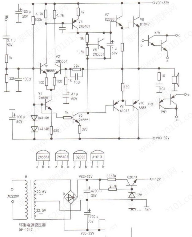 | 例1:收到其他维修同行的一台音之佳有源音箱,在大音量时声音失真。故障原因分析:试机发现该机在小音量或中等音量时音质很好,增大音量后音质变差。以为扬声器有问题,但换新后故障依旧,这说明故障在功放电路中,如图1所示。 此功放电路为经典OCL电路,为判断故障原因,从VI基极引出信号送给TDA2003小功放,调大音量,音质一直很好,这说明故障点在功率放大电路中。结合故障表现为分析,功率放大电路直流工作点正常,问题应出在交流通道中,决定用并管法进行判定。当用一只C4466型三极管并在V7的三个电极上时,音质变好,这说明V7性能不良,代换V7后故障机修到这里,终于修好值得探讨。。 例2:收到其他维修同行的一台太阳升F680有源音箱,音量很小时音质基本正常,调大音量后音质变差。故障原因分析:该机功放电路采用经典OCL形式,如图2所示。 有了例1检修经验,直接采用并管法判断故障点。当用一只C2383三极管并到v7三个电极上时,音质变好,这说明V7有问题。拆下V7测量,b-e结正向阻值13k,反向阻值为25k;b-c结正向阻值为6k,反向阻值为无穷大,由此可见v7的b-e结已损坏。更换V7后试机,故障机修到这里,终于修好值得探讨。。 |