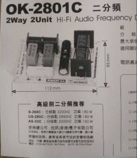 | 本人经常修功放,最近用自备的2个惠威S5,2个车用高音头,因要求不高,网购一对5寸空箱,密度板的,容积7.2升,稍小,S5等效容积接近10升,凑和也可听听音乐,分频器买了2个现成的,佳讯最普通的2801C,本想打磨一下的,结果发现用料还不错,原封不动用上了,现分享下分频器说明书附带的原理图,参数都有,完全可以自制。 |