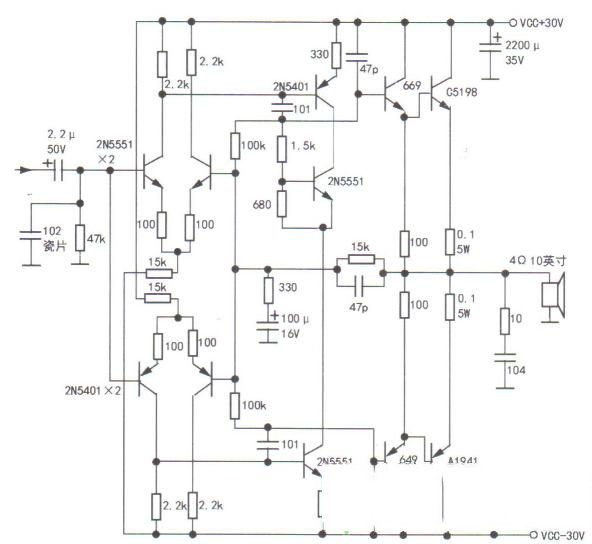 | 收到其他维修同行的一台车载用ABL宇豹低音炮,通电即烧供电保险。用500型万用表RX1挡测+12V接线柱与地之间电阻,阻值极小,这说明低音炮内部短路。拆机检查,发现直流升压电路中的两只功率管sW50N06击穿。检测升压电路其他元件,没有发现异常,于是换上IRFZ44N型场效应管(60V、35A、150W )后试机,新管发烫,看来故障另有原因。 该机直流升压电路以TL494为核心,将+12V升压成土30V(双电压),如图1所示。土30V电压一路供给功率输出电路,另一路经过降压得到土12V电压,供给双运放4558。 考虑到双运放电路工作电流较小,即使短路,也不会影响升压电路的工作状态,于是检查功率输出电路,如图2所示。 在路测量功率管的极间电阻,未发现异常。为快速排除故障,拆下功率对管A1941/C5198及中功率管649/669后上电,+30V电压正常,由此判断功率输出级存在软击穿故障。装上649/669试机,土30V电压正常;再装上C5198试机,土30V电压仍正常,这说明A1941软击穿。更换A1941后试机,故障机修到这里,终于修好值得探讨。。 |