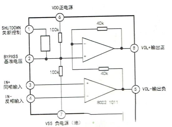 | 该音箱是一款与电脑配套使用的小型便携式有源音箱,箱内未设电源,使用时需要将附带的USB线插头与电脑USB端口连接,由电脑输出的DC5V直流电压为音箱供电。由实物测绘的电路如图1所示。 IC1、IC2是两只型号为“8002 1011"的贴片式音频功放集成电路,采用soP-8双列扁平封装,其内部结构框图如图2所示。 它属桥接BTL式功放电路,省却了自举、缓冲、消振等外围元件,还能在5V低电压条件下获得较大功率输出。当负载为4Ω时输出功率为Pp=2.5W;8Ω时PD=1.5W。其第一个放大器增益可由外部元件设定,第二个放大器增益是固定的,两个放大器输出的信号数量相同,但相位相反,两个信号相加输出,因而增大了信号输出功率。IC工作电压为DC2.0V~5.5V ,对应的静态电流为6.5mA~12mA。由于该芯片具有以上优点,目前已被广泛运用于手提、台式电脑、MINI音响、学习机、游戏机等数码产品中。 双声道音源信号经直径3.5mm插头XS输入,再由双联电位器RP1-1、RP1-2进行音量调节,分别经C1、R3和C2.R4送到IC1和IC2④脚,经内部放大、处理后由⑧、⑤脚同时驱动R.L两路扬声器SP1和SP2发声。音量电位器上带有一个联动电源开关SRP,它串接在USB-IN的5V电压(VDD)输入电路,可以实现电源开、关控制。 |