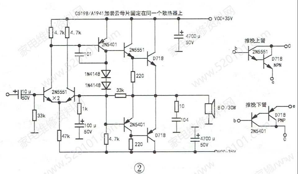 | 收到同行送来的故障机壹台功放机,左、右声道功率管A1941、C5198均烧毁。该机采用经典OCL音频功率放大电路,如图1所示。 前级两只2N5551型三极管为差动放大管,2N5401型三极管集电极串联两只1N4148型二极管,经4.7kΩ电阻接-35V供电。两只IN4148两端电压稳定在1.3V, 即功率管的偏置电压。由于硅材料二极管PN结电压稳定性高,所以偏置电压变化很小。 2N5551和C5198组成复合管,复合后的导电类型依然是NPN型;2N5401和A1941组成复合管,复合后的导电类型依然是PNP型。功放板上有两块独立的铝散热器,并且散热器不接地。通电后测左、右声道输出中点电压分别为0V,功率管基极、发射极焊盘电压为0.4V,这说明直流工作点基本正常。由于笔者手头只有D718型功率管,所以决定用D718代换A1941、C5198。 第一步:拆下右声道下推动管2N5401发射极与输出中点连接的220Ω电阻,用细铜线代替。把2N5401发射极到A1941基极的铜箔划断,2N5401集电极到vcc(-35V) 的铜箔划断,把刚才拆下的220Ω电阻焊在2N5401集电极与vcC( -35V)之间,如图2所示,即将2N5401由发射极输出变成集电极输出。 第二步:将上臂功率管D718不加绝缘片固定在散热器上,并将其引脚通过导线焊到电路板上对应的焊盘上。第三步:将下臂功率管D718垫上绝缘片固定在散热器上,并将其引脚通过导线焊到电路板上对应的焊盘.上。左、右声道推挽上臂的D718的集电极都是接vCC( +35V )电源,所以两只D718可以不加绝缘片固定在一个散热器上,而左、右声道推挽下臂的D718的集电极接输出中点,所以这两只中至少一只D718必须垫上绝缘片,否则,左、右声道输出中点就会短路。 |