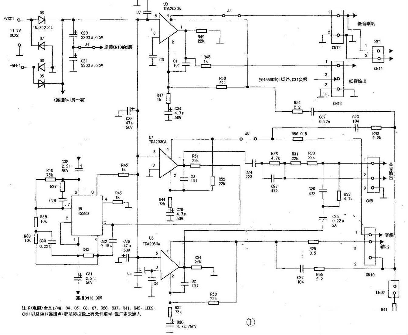 | 据用户讲述,一次开机时红色指示灯闪了一下,能播放音乐,但音箱R(右)声道没有声音。笔者看到该型音箱说明书上介绍道该型有源音箱是典型的2.1声道、配有U盘/SD卡播放功能,支持MP3音频格式,工作电源电压为220V/50Hz/260mA,喇叭单元:3英寸/4Ω、5.25英寸/4Ω。因该音箱未配有电路原理图,笔者依电路板实物绘画了功放板电路图见图1、图2、图3为功放板实物图(见下页)。JRC4558D低噪音双运放集成块各脚功能和管脚序号见表1,TDA2030A音频功放电路各脚功能和管脚序号见表2。 首先把DVD机与音箱输入和输出端连接好,开通DVD机并播放音乐,开通音箱电源开关,能听见音箱发出声音,但右声道没有声音,断电。把左、右两个声道对调,试机,结果还是右声道没有声音。断开右声道,单独听左声道,正常;断开左声道,单听右声道,没有声音,说明左、右两个声道音箱喇叭是好的,问题出在右声道电路上。 断电,拆开音箱后盖,目测电路板比较新,未发现有异味以及电路元件损坏、电容顶包漏液等情况。重点检查右声通电路电子元件,经测量检查发现功放管U8的④、⑤脚对比功放管U7、16的④、⑤脚的阻值有变小的现象。拆下U8测量,阻值确实变小,怀疑U8损坏。将U8代换上同型号(TDA2030A )后试机,故障不变,说明不止U8功放管损坏还有其他故障。U5是有源音箱常用的双运放集成电路,在路测量U5未发现异常,试用同型号代换U5( 4558D )后试机,此时右声道已有声,说明故障是U5( 4558D )双运放引起的。可是声音是有了,但右声道的声音太小。经用放大镜检查,发现在功放管U6外围的C2、C30、R53、R32、R34、C25、C26七只元件都不同程度有虚焊的现象,补焊后试机,左、右声道都能正常发出声音,调试音量大小正常,至此维修结束。 维修总结:1、有源音箱不像家庭影院音响电路那样设有单独的左、右声道功放电路,因为有源音箱绝大多数都是通过一只或几只功放管来实现左、右声道同步功率放大,再通过喇叭发声。当出现左声道或右声道没有声音故障时,可先检查功放管是否有损坏或阻值变小,甚至短路的现象,如故障还未能排除,再通过检查双运放集成块或代换双运放,故障能解决的。值得提醒的是用放大镜去检查电路焊接的情况,有很多疑难故障是通过补焊得到解决的。2、笔者收到故障机这台音箱双运放的型号是4558D。4558D是低噪音双运放集成块中最普通的型号,在市场上售价几元一只,如遇到4558D损坏可直接用同型号代换,条件允许的话可用NE5532、AD827(AD827是美国公司生产的双运放,音质好,正品在市场上售价为50元一只)代换。 |