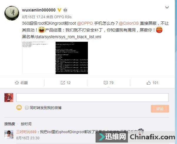 | 对于不少狂热的手机发烧友来说,获取root权限,刷机随意改造手机,是他们选择Andriod系统的理由所在,不过获取root权限的难易程度还真得看用户所持手机的厂商态度了,开放那还好说,如果封闭的话,那就惨了。 微博网友wuxianlin000000称360超级root和Kingroot能root @OPPO 手机如何维修?@ColorOS 直接屏蔽,不让其启动!产品经理:我们就不打安全补丁,你知道我有漏洞,屏蔽你! 从他给出的OPPO家Color OS的相关文件/data/system/sys_rom_black_list.xml看,系统一旦检测到用户装有签名为com.qihoo.permmgr(360超级root的安装包名)与com.kingroot.kinguser (Kingroot的安装包名)的APP,就禁止它们启动(startForbidden)。 那么360超级root与Kingroot为什么会进OPPO的黑名单了?因为它们能够帮助用户获取root权限,获取了root权限之后的用户,只要找到合适的recovery,便能刷其他第三方的ROM,比如flyme、MIUI等,一举成为其他手机品牌的用户,这样OPPO的用户便流失了。 |