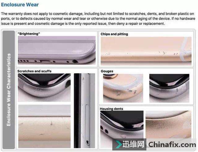 | 最近在网上曝光了一份苹果公司售后“外观检查标准图文”这份图文大致描述手机外观根据磨损程度享有哪种保修级别。图文为VMI苹果公司内部售后部门培训课程,那么到底是怎样的,带大家来参观一下: 上图中绿色部分为手机外壳与屏幕细微伤痕。在保修范围黄色第一层为手机内部主板防水贴,变红测表示内部进过水,付费维修排扣密封胶无被起动痕迹,有测付费维修,黄色第二层屏幕轻微碰碎,付费维修,壳体磕碰导致屏幕翘起,付费维修,黄色第三层第二张图变形和屏幕分离,付费维修,红色手机摔烂,付费维修。 上图为外观正常磕碰磨损,在保修范围。 好啦,以上为苹果售后确认保修服务标准,如果你的手机有问题要拿去售后想看看有没有算坏到上面那种程度吧。还有以前去过苹果售后的朋友,在苹果售后有没有遇到过什么奇葩问题? |