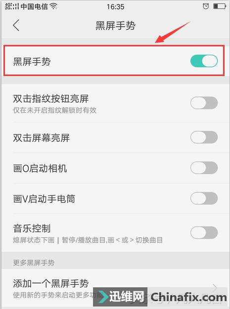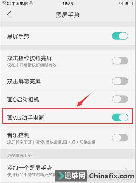 | 第一步:点击【设置】按钮 第二步:点击【手势体感】 第三步:点击【黑屏手势】 第四步:勾选【黑屏手势】 第五步:勾选【画v启动手电筒】 注:1.所谓【画v启动手电筒】,就是在手机屏幕幕幕上写一个v字,手电筒就会自动打开 2.按一下电源键,就会快速关闭手电筒。 |