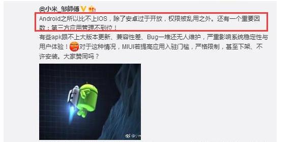 | 安卓手机一直有着“越用越慢”的口碑,这也是很多一部分用户弃安卓而花高价投入苹果IOS怀抱的初衷吧。确实人家IOS用多久都流畅,这个是有口皆碑的。而安卓系统一开始各种流畅,一年后发现卡慢死机现象接踵而来。让用户苦不堪言。这难道是手机厂家每年都要更新的目的? 暂且不论厂商的用意,我们不妨分析一下IOS和安卓系统的差别。首先最简单的就是开源和封闭,众所周知,IOS是封闭式的系统,所有的APP都要经过苹果协议才能够上架,这样就很好的对软件进行了管控,对于吃内存影响稳定性的程序,IOS会责令整改,甚至下架。而安卓属于开源,说白了只要你懂编写APP,你就编写一个病毒也能够通过引导让用户轻易安装,更别说占内存这等小事了,毫无管控,后台自动启动;启动短信能够打开“淘宝,微信,新闻”等等APP的后台,最近在用一款安卓手机,明明重新启动手机后,总能有一堆广告推送,观察发现都是由不一样使用发出,这就纳闷了,到底是什么逻辑触发的呢?作为一个普通人,我只知道运行的程序越多消耗内存肯定就更大的道理。所以随着新买手机一年后装了越来越多的使用后流畅才怪。这就是安卓系统。 来自小米公司高级工程师的微博透露,安卓之所以比不上IOS,除了开源问题,权限被乱用之外,还有一个重要原因就是第三方使用管理不到位。 并提出第一步MIUI将开始对使用商店中上百万的使用进行压力测验,淘汰不合格者; 不知哪种故障后来这位工程师对这一微博进行了隐藏,难道是怕友商提前做了? 由此可以推断出,未来的小米MIUI走向已经非常显著了,就是要打造一款对第三方使用严格把关的系统,那么以后可能会涉及很多使用商家不愿意整改咋办?用户又想装如何维修?想法虽好,但要实现起来还得与第三方使用商齐心协力才行;但不管怎么样,我是绝对支持小米先行搞定这安卓历史问题。 |