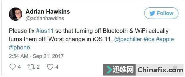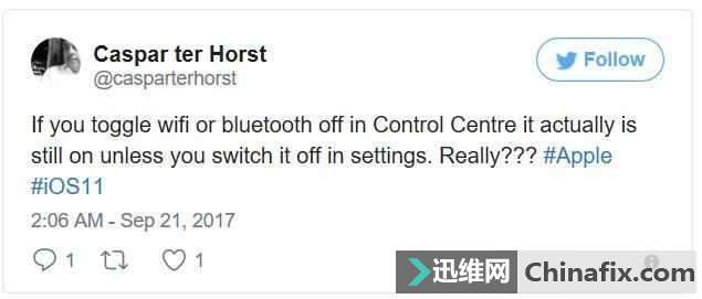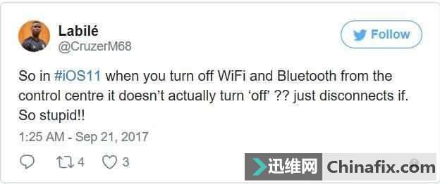 | 昨天匆忙升级了苹果iOS11,看到了很多新功能,包括更自定义化的控制中心,没想到这个升级今天就爆出了问题。 据海外科技媒体BGR报道,即便用户在控制中心关掉Wi-Fi和蓝牙,也不代表完全关掉了它们,无论是苹果手表、Airdrop、Airplay和位置服务都依然处于连接中,而其他的苹果服务将继续运用Wi-Fi。 但如果你运用的是非苹果设备,举例说其他品牌的蓝牙耳机,将与iPhone断掉连接。 那么,这真是一个Bug吗?BGR分析称,这样做有一定原因,因为iPhone会在低耗能使用上被动运用Wi-Fi,一旦关掉Wi-Fi,不仅会损害这些使用,也不利于节省电量,所以让后台服务保持运行,同时禁用它们连接Wi-Fi和蓝牙功能,看上去是一个不错的选择。 即便如此,社交网络推特上却吐嘈声一片,比如下面这条,网友直呼,这是真的吗? 这名网友更直接,他表示这太愚蠢了。 这名叫安德烈.霍金斯的网友呼吁,请修好这个Bug,这简直就是苹果iOS11最糟糕的变化。 其实,要完全关掉Wi-Fi和蓝牙,方式也很简单,就是进入设置中依次关掉,因为控制中心的开关和设置中的开关是不一样的。 其实,我也希望在下一个苹果iOS11更新中,苹果能搞定这个问题,毕竟在控制中心中开关Wi-Fi和蓝牙就是1-2秒的事情,但进入设置中再开关就要慢得多了。 |