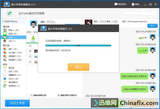 | 怎样查微信历史聊天记录?删除的微信聊天记录怎么查看?微信是我们手机里最常用的一个软件,在我们微信里有许多对于我们非常重要的微信聊天记录,如果我们不小心删除了,那么我们一个怎样查找微信删除的聊天记录?删除的微信聊天记录怎么查看?接下来我就来告诉大家如何对我们删除的微信聊天记录进行查找。 一、iPhone手机怎样查找微信删除的聊天记录? 准备工具: 1)常用电脑; 2)iPhone手机和数据线; 3)强力苹果恢复精灵; 恢复教程: 1、首先我们需要将最新版本的强力苹果恢复精灵下载到我们的电脑里,因为我们需要利用这款软件对我们删除的微信聊天记录进行查找。 2、接下来我们将iPhone手机连接电脑,然后运用iTunes软件备份iPhone手机数据。 3、数据备份完成后,运行这款强力苹果恢复精灵,点击界面上方的“从iTunes备份文件恢复”选项,软件会主动的扫描出我们备份好的手机数据,接着我们点击“开始扫描”按钮,软件就会开始进行扫描。 4、等待软件扫描结束之后,点击“微信”选项,对删除的微信聊天记录进行查看,我们查找到需要恢复的微信聊天记录后,点击“导出选中记录”恢复删除的微信聊天记录。 二、安卓手机怎样查找微信删除的聊天记录? 准备工具: 1)常用电脑; 2)安卓手机和数据线; 3)强力安卓恢复精灵; 恢复教程: 1、首先我们需要将强力安卓恢复精灵下载到电脑上,利用这款软件我们就可以查找我们删除的微信聊天记录。 2、接下来将安卓手机连接电脑,然后运行这款软件,软件打开后,我们可以在软件的界面当中看到三个功能,我们可以选择其中的“免ROOT恢复”功能,进行微信聊天记录恢复操作。 3、接着软件就会扫描出安卓手机信息,然后我们可以点击软件下方的“快速扫描”或者“深度扫描”选项对安卓手机进行扫描。 4、等待软件扫描结束,点击“微信”选项,即可对删除的微信聊天记录进行查找,我们找到想要恢复的微信聊天记录后,点击“恢复选中文件”按钮,将删除的微信聊天记录恢复。 上述就是我想要告诉大家的微信聊天记录查找方式,我们只需要按照上面的方式进行操作,那么我们就可以对删除的微信聊天记录进行查看了,以后如果再次错删重要的微信聊天记录时,我们就可以运用上面的方式恢复我们删除的微信聊天记录。 |