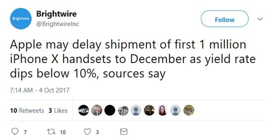 | iPhone 8/8 Plus销量不尽如人意已经是事实,国内电商渠道甚至在前两天给出了低于官网价600元的优惠,可见一斑。 对于苹果来说,这一切需要接下来的iPhone X来逆转。此前,郭明池曾强调,iPhone X顶部的这套原深感应模块,领先安卓两年半的时间。 不过,iPhone X最大的问题就是需要到10月27日才能开启预购,11月3日上市,产量一直有消息称很吃紧。 据财经新闻站Brightwire报道,消息人士称,iPhone X的产量低于10%的预期,也就是还有90%未在富士康完成组装,所以首批百万部需要推迟到12月了。 这已经不是我们第一次听到相似的新闻了,从来源的广泛性可以判断,iPhone X的生产问题应该不是苹果的一种饥饿策略,而是正面对的棘手事实。 关于产能缘何问题重重,其实就是“刘海”中点阵和红外传感器造成的,当然还有那块诡异的OLED异形全面屏。 |