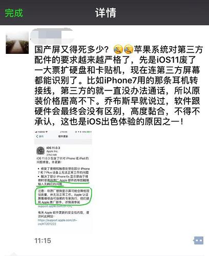 | 今天凌晨,苹果再次更新了苹果iOS11系统,这也是苹果iOS11正式版发布以来的第三次更新,苹果iOS版本为11.0.3,这次的更新主要针对iPhone6s/iPhone7设备。有小伙伴升级了吗?感觉怎么样?小编当然也是第一时间升级了,相比上个版本,这个版本几乎没有什么变化,不过好像变的有那么一点点流畅了。 这次和上次一样,都是以修复漏洞为主,上次苹果iOS11.0.2,主要修复iPhone8听筒出现杂音问题,但是很多小伙伴更新之后发现,个别iPhone8依然有杂音问题。 这次苹果iOS11.0.3更新主要是修复iPhone7/7Plus音频和触控反馈问题。同时也修复了iPhone6s更换非原装显示屏,触控不管用的问题。 当然还有一点,被闹得沸沸扬扬,那就是更新下面的注意。很多人就把这句话给误解了,到底是什么意思呢? 原话是非原厂替换显示屏可能会降低视觉质量,并无法正常工作,Apple认证屏幕维修由可信赖的专业人士执行,他们运用的是Apple原厂部件。 就是这么一段话,引起了很多误解,朋友圈现在已经传疯了,很多人以为,如果你的iPhone换了非原装屏幕就不能用了,必须要用原装显示屏。 大家都知道原装显示屏非常贵,而市面上iPhone换屏通常比较便宜,很多人的外屏碎了,直接换外面的玻璃就ok了,但是去客服就需要换一整块显示屏。 其实这段话的意思非常简单,那就是说,非原装屏幕质量没有原装屏幕好,可能会影响你的观感,也有可能造成iPhone无法正常功能,建议大家换原装显示屏。就是这个意思,却被很多人误解。 |