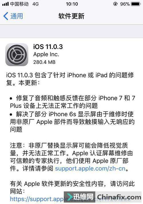 | 就在上周,苹果正式向用户推送了苹果iOS11.0.2的版本更新,在苹果iOS11.0.2版本更新中,苹果带回了用户期待已久的3D Touch侧边按压功能。 而时隔一周,也就是在今天凌晨,苹果又继续推送了ios11.0.3的系统版本更新,这次的更新修复大量的漏洞,而且首次在更新系统版本中对于山寨未认证屏幕做出了回应。 在这次的版本推送说明中,我们看到苹果修复了音频和触感反馈在部分iPhone 7和iPhone 7 Plus设备上无法正常工作的问题。搞定了部分iPhone 6s显示屏由于维修时运用非原厂Apple部件而导致触摸输入无响应的问题。 其中,对于这次版本推送中,最吸引人注意的就是搞定了部分iPhone 6s显示屏由于维修时运用非原厂Apple部件而导致触摸输入无响应的问题,还有系统更新的内容注意。 这两条都对非认证屏幕做出了相应的官方态度:那就是你可以运用非原装iPhone手机屏幕幕幕,我们也会尽量给你进行系统优化,但是还是推荐运用认证了的iPhone手机原装屏幕,非原装的可能会因为硬件问题导致无法正常工作。 而我们知道,苹果一向对自己产品的硬件配套设施管控的非常严格,就比如数据线,如果未经过认证,山寨的直接不能进行充电作业。而这次对非认证屏幕的首次表态,是不是默许了山寨屏幕的存在呢? 这一点我想只有苹果官方公司才能给出答案,但是对于普通消费者来说确实是一个好消息,更换的非原装屏幕的网友也不用担心苹果忽然进行硬件认证了,但是还是推荐更换屏幕的用户去正规商店,其硬件设施有保障,也有较好的产品售后。 总的来说这次的ios11.0.3版本推送更新还是值得升级的,特别是那些因为更换非认证屏幕而导致触控不灵的用户,试试更新这次的新版本,看看会不会恢复正常呢?你的手机屏幕幕幕更换过吗?用了多少钱呢?欢迎评论! |