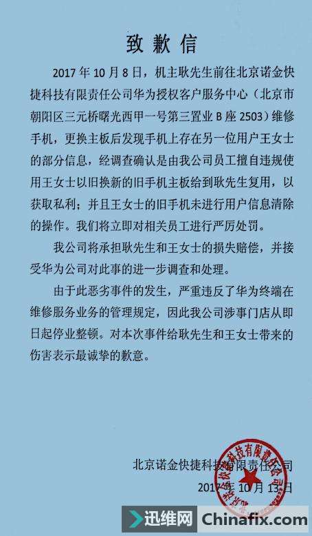 | 近日,有华为P9 plus机主爆料,其前往华为官网指定的客户服务中心进行手机维修,“华为官网指定客户服务中心给自己换主板机型更换了二手主板,并且未删除上一任机主用户数据”,对此华为终端昨晚针对这一事件发表了官方声明。 声明中称,这一事情发生在华为官网指定客户服务中心北京诺金快捷科技。由于对供应商的监管不力造成用户损失表示歉意。同时涉事门店已被勒令停业整顿;华为会在服务流程和监管上积极改进,避免相似事件发生。早些时候,华为官网指定客户服务中心北京诺金快捷科技曾发表过独立的声明(点此看原文),称“经调查,确认是由其公司员工擅自违规运用客户王女士以旧换新的旧手机主板给到耿先生复用,以获得私利。 |