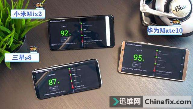 | 华为mate10刚刚发布后国内外的科技届是一片惊叹,拥有麒麟970处理器成为挑战三星、苹果的一个利器。而华为mate10的安兔兔跑分为173682分,这成绩非常理想,和高通现在最新处理器骁龙935性能差不多,和拥有骁龙835处理器的小米Mix2和三星S8在跑分上比较,性能到底如何呢?我们就用安兔兔来一起跑一下吧! 三台手机摆在桌子上,同时打开安兔兔跑分软件,开始测验! 我们可以看到,三台手机首先在3D性能上测验时候最先进入的场景的是小米Mix2,其次是华为Mate10,最后是三星S8。 在3D性能测验《孤立》和《花园》两个场景中,都非常流畅,率先完成测验的也是小米Mix2. 接下来就是对性能的分析了,在这里快进了分析过程,最后跑分的结果令人感到意外! 小米Mix2的跑分为177221,华为Mate10的跑分为173867,而三星S8的跑分为164540。 华为mate10的在跑分上完胜三星S8,却输给了小米Mix2。在回顾刚才的性能测验中,小米Mix2一直一路领先,华为Mate10其次,最后一名是三星S8,这也对应了刚刚跑分的排名。 同样是骁龙835处理器,小米Mix2可以说是完爆了三星S8,也略胜麒麟970的华为Mate10,这说明硬件优势还是不够的,系统上的优化也非常重要! |