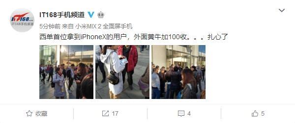 | 今天,国行iPhone X正式开卖,除了此前在官网预定的首批用户可以拿到新手机之外,预约到店购买的用户同样可以前往此前预约的苹果直营店自提。 据媒体消息,北京西单首位拿到iPhone X的用户已经诞生,从图片来看是个妹子,脸上洋溢着拿到iPhone X之后的喜悦心情。 按照以往的惯例,首批iPhone都会在门口被黄牛党大肆加价收购,上千元问题不大。但今年iPhone X这个情况有点扎心,@IT168官方微博表示,黄牛只肯加价100元收购。 其实这并不是黄牛心太黑,而是iPhone X的价格真的没有炒起来,这跟苹果供货较多有很大的关系。 昨天我们获得的首批iPhone X黄牛报价显示,最高加价也不过是千元左右,算是非常良心了。 当然,考虑到iPhone 8系列上市当天直接破发,这次iPhone X的表现已经足够让苹果松口气。 Update: 银色版黄牛加价100,黑色版加价400-500不等,最终黄牛以加价800-1300元左右进行销售。 |