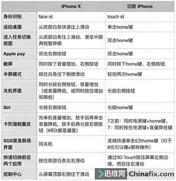 | 今天是iPhone X首发的日子,很多用户已经拿到了自己的手机。取消了Home按键,很多用户拿到了iPhone X之后可能有点迷茫。下面请大家跟着小编的脚步一起看看iPhone X的新UI吧。 iPhone X使用技巧 由于取消了Home按键,之前大多数要通过Home按键完成的操作都改成了运用手势。Apple Pay呼出方式由双击Home按键改为了双击电源键,支付方式也由指纹改成了Face ID。 iPhone X使用技巧 没有了Home按键应该怎么返回桌面呢?其实很简单啦,只要按住屏幕下方的“白条”向上滑动即可。 iPhone X使用技巧 打开后开和返回桌面的操作几乎一致,只要按住屏幕下方的“白条”向上滑动至屏幕中间位置,短暂停顿后就可以打开后台了。 iPhone X使用技巧 操作中心的呼出方式做了较大的改动,为了避免和返回桌面冲突,由原来的从下向上滑动,改为从屏幕右侧向下滑动。 iPhone X使用技巧 此外,截屏变成了同时按下音量增加、右侧(电源)按钮;关机变成了同时长按右侧(电源)按钮、音量增加(或音量降低,或同时按住增加和降低);长按右侧(电源)按钮可呼出Siri。 由于取消了Home按键,操作交互有了很大的变化,用户还需要时间来熟悉。有热心网友作出了一份操作对比,希望大家能更快的习惯新的操作方式。 iPhone X使用技巧 |