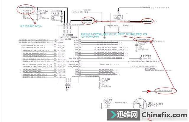 | 数据线送来的5V电压PP5V0_USB经过尾插接口 J1817 —路送到Q1701产生PP_TRISTAR_PIN (5V)送到 U1700 (相当于5S的U2),插入数据线时,在电容C1704 KT以量到5V的电压PP_TR丨STAR_PIN。 iPhone6手机充电检修思路 图1 另一路送到 U1401 (充电),插入数据线时在电容C1408 可以测到5V的电压(PP5V0JJSB),这两路5V电压(电容C1704可以量到5V的电压及C1408测到5V的电压)有一路不正常,手机会提示“可能不支持此配件”或者有充电符号 但杀死电量越来越少,如果PP_TRISTAR_PIN不正常,还会出现关机可以充电开机后就无法充电,当然也不能连电脑了。当然U1700虚焊或者破坏也会造成同样的现象。 iPhone6手机充电检修思路 图2 如果出现充电或者连接电脑不正常的问题,首先插入数据线,测量C1704及C1408是否都有5V,如果5V正常那么检测C1411、C1412是否都有3.7V的电压,如果都有那么重装或者更换U1401、U1700,当然电源IC-U1202也会造成充电问题,排除U1401、U1700后更换或者重装 电源IC-U1202。 iPhone6手机充电检修思路 图3 另外Q1701也容易破坏造成PP_TRISTAR_PIN不正常,会出现关机可以充电开机后就无法充电、开机充电提示不支持此配件也不能连电脑,可短接,如下图: iPhone6手机充电检修思路 图4 手机维修技巧分享 一、飞线法:由于手机被摔或拆卸带有封胶的芯片时,焊盘掉点是经常的事,除空点外,有用的掉点要飞线来搞定,通常是在该点相连的引线上或元件上用细漆包线连接后,在焊盘的掉点处用镊子把去掉绝缘的引线头弯成焊点大小的圆圈,用绿油把引线固定,在紫光灯下(常用紫光灯验钞器)烤30分钟左右即可。芯片以外的断线,同样可以用飞线的方式搞定。 二、补焊法:手机在运用过程中,经常按键、翻盖、被摔,容易出现虚焊或接触不良引起多种问题,通过放大镜观察或用按压法判断出问题部位,进行补焊搞定问题。 三、调整法:由于发射信号过强引起的发射关机、过弱引起的发射复位、重拨等问题时,检修或更换功放、功控电路无效果的,可适当调整相关电路中元件数值达到修复目的。如摩托罗拉V998和诺基亚手机,由于发射功率过大引起发射关机,均可增大功控电路中的电阻去搞定;如属发射功率小引起的发射重拨可减少预放管基极供电电阻,增大预放的放大量,使手机正常工作。 四、天线法:简单实用,在检修射频电路问题时,用10厘米左右长导线或锡丝、镊子、示波器探头作为假天线,分别连接在信号通路的输入端和输出端,如在某元件的输入端接上假天线手机正常工作,说明假天线以后的电路正常,然后把假天线移到此元件的输出端,如不能正常工作,问题就在此元件。 |