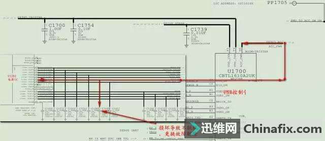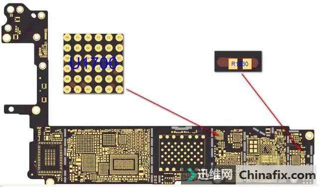 | 案例一 手机不联机不联机主要有两个方面引起:1.U1700(USB控制管)工作条件不具备;2.U1401(充电管理IC)破坏导致。 首先检查U1700(USB控制管)的供电、复位都正常,发现E3脚E75_TO_TRISTAR_CON_DETECT(附件检查信号)本应该有电压的,测验发现没有电压,查看图纸又检查通路发现R1830破坏,更换问题解除。如图所示: iPhone6手机不联机检修思路(图1) iPhone6手机不联机检修思路(图2) 案例二 手机不联机主要有两个方面引起:1.U1700(USB控制管)工作条件不具备;2.U1401(充电管理IC)破坏导致。 首先检查U1700(USB控制管)的供电发现3.3V供电不正常,查看图纸接着查看3.3V供电通路,发现C1299电容破坏,跟换后问题解除。如图所示: iPhone6手机不联机检修思路(图3) iPhone6手机不联机检修思路(图4) iPhone6手机不联机检修思路(图5) iPhone6手机系列维修案例主题相关专题帖:http://www.jdwx.cn/thread-1030310-1-1.html |