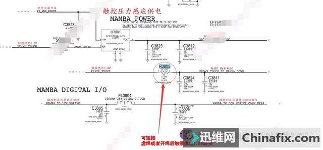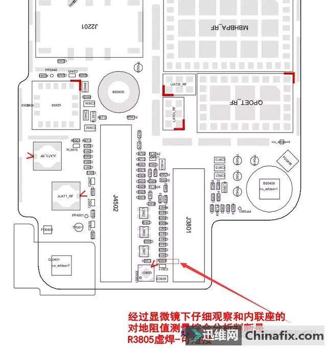 | iPhone7手机触摸失灵维修技巧(图1) 上图中是收到其他维修同行的一台换屏的iPhone7 换好以后手机触摸失灵,又换了一个屏幕试机问题依旧,刷子粘洗板水刷了一下内联座再试机还是问题依旧,只能检查电路了,显微镜下仔细观察内联座附近,发现电阻R3805疑似虚焊,后来测了一下内联座对应角的电压和对地阻值发现异常,于是果断短接R3805的焊点,再试机,问题排除,如图所示: iPhone7手机触摸失灵维修技巧(图2) iPhone7手机触摸失灵维修技巧(图3) |