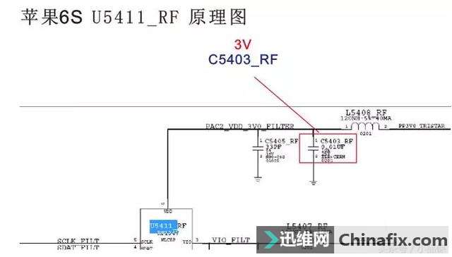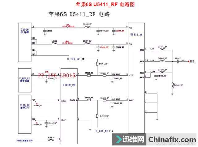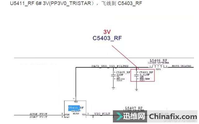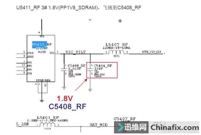 | 1、不装SIM卡,反复跳出运营商。正常机器不装SIM卡只会跳出一次,如果反复跳出未安装SIM卡是不正常的。 2、装卡大多数可以读卡,有的机器还会有信号打接正常,但2G、3G信号强,4G 很弱。若无信号的时候,屏幕左上角信号条的位置会反复跳运营商则不正常。 搞定方式: 检查发现:U5411_RF 控制管有问题,就会出现上述的现象,大多数为入水机,供电断线引起的。 若U5411_RF 6#、U5411_RF 3#无电压,就用飞线搞定。 两组供电:U5411_RF 6# 3V(PP3V0_TRISTAR),飞线到 C5403_RF 即可搞定问题。U5411_RF 3# 1.8V(PP1V8_SDRAM),飞线到C5408_RF即可搞定问题。 飞线1 飞线2 |