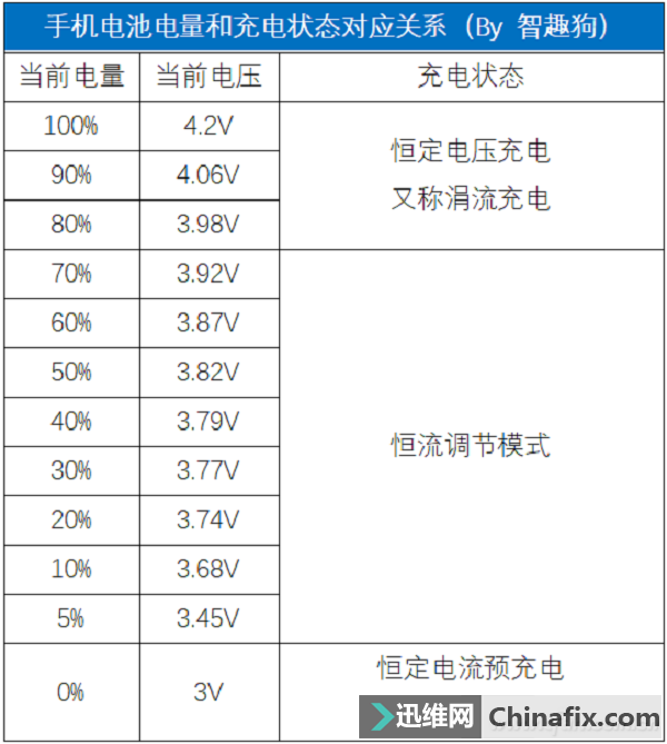 | 对智能手机而言,影响续航的因素有很多,比如电池容量(越大续航越久)、充电功率(越高充电越快)、硬件(如处理器)耗电、系统省电优化等等。其中,手机电池容量,或者说电池结构和充放电原理,则是一切的基石所在。 充电时间太久?续航时间不够?先搞明白手机电池的原理吧! 图 智能手机电池结构 如今数码产品内置的都是“锂电池”,其内部主要是由含锂化合物的正极材料(如今锂电池的正极材料多为钴酸锂、锰酸锂、三元材料(镍钴锰酸锂)和磷酸铁锂)、电解质、隔离膜、负极材料(石墨)和外壳五个部分组成。 充电时间太久?续航时间不够?先搞明白手机电池的原理吧! 图 其中,正极和负极材料都被嵌入到电解质中,而隔离膜则处于正负极之间,是避免它们直接接触导致短路发热进而引起燃烧爆炸的“防火墙”。 充电时间太久?续航时间不够?先搞明白手机电池的原理吧! 图 锂电池无论是充电还是放电,其实都是锂离子在电池的正极与负极之间移动,并将电能和化学能相互转换的过程。在充电时,正极材料分子中的锂元素会被分离出来,变成一个带有正电荷的锂离子(Li)。在外加电场的作用力下,这个锂离子会穿越电解质和隔离膜,到达终点负极后会与其中的碳原子发生化学反应生成LiC6,并稳定地嵌入到负极的石墨层状结构当中,最终实现存储能量的过程。在放电时,锂离子在化学反应的作用下会从负极重新移动回正极,这个过程会形成电流从而为数码产品供电。 充电时间太久?续航时间不够?先搞明白手机电池的原理吧! 图 锂离子在从正极到负极之间“旅行”时,单位时间内可从正极分离出来的锂离子越多,意味着这块电池可以存储的电量也就越大。如今智能手机都想在保持性感身材的同时塞进更大容量的电池,就只能通过增加正极材料和改进正极材料来提升“能量密度”这个参数了。 锂聚合物电池一统江湖 锂电池根据内部电解质形态的不同,又可细分为“锂离子电池”(Li-ion)和“锂聚合物电池”(Li-poly)。其中,当电解质为液体时就是“锂离子电池”,它需要使用金属外壳密封包裹防止漏液,所以质地较硬,18650电芯就是“锂离子电池”的典型形态。“锂离子电池”的优势是成本低,但缺点则是极端情况下存在爆炸的风险。 充电时间太久?续航时间不够?先搞明白手机电池的原理吧! 图 当电解质为固态或凝胶态时则是“锂聚合物电池”,这种形态的电池可以用软膜包裹,可以做成扁平甚至L型的样式,在极端情况下以燃烧为主,安全风险相对要好一些。目前智能手机和轻薄型笔记本都已过渡到“锂聚合物电池”时代。 充电时间太久?续航时间不够?先搞明白手机电池的原理吧! 图 需要注意的是,通过Android版的AIDI64等软件可以查看手机电池技术是Li-poly还是Li-ion,但从众多网友的拆解和反馈来看,很多显示Li-ion型号的手机电池其实仍然是锂聚合物电池,所以我们不必在这个方面纠结。 充电时间太久?续航时间不够?先搞明白手机电池的原理吧! 图 新手机电池需要激活吗? 这是一个老生常谈的话题,在功能机时代部分手机还在使用镍镉充电电池,由于其出厂时没有完全激活,才需要用户购买新机后首次使用前充满12个小时来防止记忆效应。然而,如今的智能手机早已过渡到锂电池时代,内部具备完整的控制IC和电路,不存在所谓的“激活”说法,首次使用充满后随时都可拔下。 充电过程中的三种状态 锂电池在充电时会遵循“P=IU”(功率=电流×电压)的物理公式,它将电能转换为化学能的充电速度,最终就反映在充电功率这个参数上。理论上讲,提升电流和电压都能增加电池的充电功率,但考虑到锂电池自身的安全特性,避免因欠压或过压而导致电池损伤或爆燃,每一款手机体内必然会配备完善的电源电路,其中尤以充电控制芯片和电源控制芯片最为重要。 充电时间太久?续航时间不够?先搞明白手机电池的原理吧! 图 其中,电源控制芯片主要负责对电池进行充电,并实时检测充电和电池当前的电压值;充电控制芯片用于保护电池过放电、过压、过充、过温,从而有效地保护电池寿命和使用者的安全。 在实际应用中手机厂商们通常会设定三种不同的充电状态:“恒定电流预充电”(Constant Current Pre-charge Mode)、“恒流调节模式”(Constant Current Regulation Mode)和恒定电压充电(Constant Voltage Regulation Mode)。 其中,“恒定电流预充电”应该是最容易被我们忽略的状态,所以在这里小编就先简单介绍一下:很多手机在长时间不用时,即使连接充电器也无法开机,很容易让人产生一种“手机不会坏了吧?”的疑虑。 充电时间太久?续航时间不够?先搞明白手机电池的原理吧! 图 原因很简单,手机内置锂电池的电压也会随电池容量的减少而降低。当电池电量完全消耗到0%时,其电池电压往往会降到3V以内。此时连接充电器,手机内部电源转换器所产生的电压还不足以满足微处理器触发电源、复位、13MHz时钟信号等开机条件,需要“恒定电流预充电”以较小的恒定电流(普遍为设定电流的1/10)对锂电池进行充电,使其慢慢恢复活性(将电池电压提升到某个阈值,如高于3V)才能触发开机操作。 *电池百分比和电压对应关系是可自定义的,本表只是为了便于大家理解,数据仅供参考 开机后,电源控制芯片就会尝试与充电器进行“握手协议”(不同的快充标准都有自己的一套 兼容标准),进入“恒流调节模式”状态,并