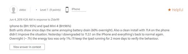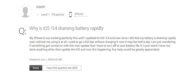 | 你升级苹果iOS 11.4了吗?数个外媒报道了苹果iOS 11.4导致的用户吐槽手机耗电快、电池续航变短的问题。 你遇到了吗?用户吐槽升苹果iOS 11.4后手机耗电快 图1 你遇到了吗?用户吐槽升苹果iOS 11.4后手机耗电快 图2 在苹果官方论坛,ID Zide99的用户发起的“苹果iOS 11.4耗电过快”话题已经收到了“854人投票赞成”。Zide99称,自己的iPhone 6升级苹果iOS 11.4后电池越发不耐用,手机耗电快,原来能坚持一个白天,现在只有半天。 此外,还有一些更“夸张”的吐槽,比如苹果iOS 11.4的iPhone 6s满电重新启动后待机,4个小时过去后只剩下了40%电。 你遇到了吗?用户吐槽升苹果iOS 11.4后手机耗电快 图3 注意,不少用户都强调自己的电池健康度是在90%以上的。还有一位ID ziebo的有用评论称,他的iPhone 6s降级到苹果iOS 11.3.1之后,电池续航又恢复如初了。可惜的是,苹果已经关闭了苹果iOS 11.3.1的验证通道。 |