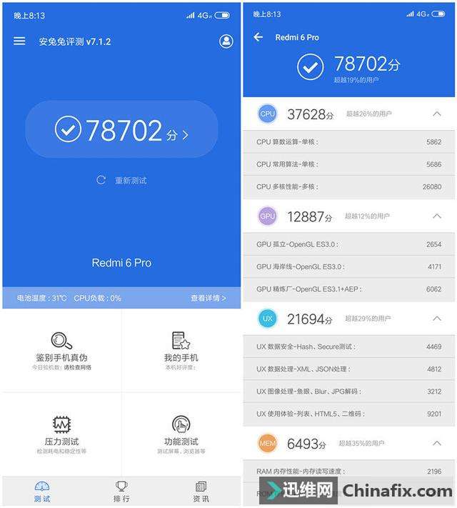 | 2017 年 12 月,一直以「性价比」闻名的小米首次向用户推出不够千元的全面屏系列手机——红米5 系列。该系列机型的首次亮相也标志着全面屏不再是中端乃至旗舰的标配,其亲民的售价也能让每个用户可以在第一时间尝鲜主流的显示技术。 入门级全面屏机器除了可以满足部分消费者的实际需要外,还充当着「引路者」的角色,这一角色至关重要,因为其能让更多理智型消费者了解到主流的全面屏是否确切符合自己的需要,进而购入更高层次的全面屏机型。 但全面屏发展至今,智能手机市场早已不再是常规全面屏机型主导的,更多的是各式各样的异形全面屏横行。这也让用户开始迷茫,这样的带有「刘海」的机器真的好用吗?软件、视频、游戏等使用显示效果上与刚习惯的常规全面屏是否异曲同工呢?这些问题都是消费者所关心的,听千言万语不如切身体会来得直接。 但现在手机市场上的「刘海」屏机器又在千元以上,使得大多消费者望其却步。因此,红米再一次充当「引路者」的角色,其正式向市场推出首款起售价不够千元的「刘海」全面屏机器——红米6 Pro。今天,我们一起来看看这款不够千元起步的红米6 Pro 会给我们带来怎样的第一观感吧! 从上面配置信息可见,这是一款妥妥的入门级别机型,其搭载的依旧是主打低功耗的骁龙 625 移动平台,不过标配 1200万 + 500万 像素双摄像头这点值得称赞。接下来,我们来仔细看看该机在各个方面的表现如何。(本次测评的红米6 Pro 为蓝色 4GB RAM + 64GB ROM 版本,系统为 MIUI 10 内测版)。 外观 既然是千元内首款「刘海」全面屏机器,该机在外观上有着怎样与众不一样的表现呢?红米6 Pro 正面搭载一块 5.84 英寸辨别率为 2280 x 1080 的异形全面屏,其屏幕比例为 19:9。这一屏幕比例加上「刘海」屏的规划也使得其带来的直接观感在同等价位全面屏机型中遥遥领先。 虽说该机的屏幕尺寸达到 5.84 英寸,但由于其机身采用圆滑过渡的规划且屏幕边框在同价位机型中还属得当,使得该机在日常运用中依然能保持着小屏手机的身材,在日常软件的运用中也能轻松做到单手掌控。另外,该机屏幕同时还支持阳光屏、夜光屏、护眼模式以及智能环境适应模式等在小米手机上成熟的屏幕技术。 再看红米6 Pro 的「刘海」位置,因为其「刘海」位置仅有光线感应器、听筒以及500万 像素摄像头三个元器件,这也使得其「刘海」相较于自家的小米8/SE 窄上不少。在小黑原以为该机并没有配置呼吸灯这一规划时,在充电时注意到该机的呼吸灯已被移至左下角。 若只看红米6 Pro 的背面,该布局很好的贯彻小米今年家族式的经典规划,相信就算是资深米粉,第一时间也很难辨别出红米6 Pro 与红米Note 5 的分别,一样的布局,一样的三段式金属机身。左上角 1200万 + 500万 像素双摄像头,闪光灯在两颗摄像头中间,指纹识别技术位于背部中上位置,「MI」 Logo 在背部机身底部。 其它方面,该机底部毫不意外的采用 Micro USB 接口,左侧为降噪麦克风,右侧为扬声器;机身顶部为 3.5mm 耳机接口、次降噪麦克风以及红外遥控传感器。 机身左侧仅有一个 2+1 卡槽开孔,双卡双待的同时还支持储存卡扩展;右侧依旧是传统的音量加减、电源键。 在外观上,红米6 Pro 除了正面采用「刘海」屏这一亮点之外,其它方面给人的第一感觉就是熟悉,与红米Note 5 一样的机身规划,一样的材质做工。当然,其机身整体做工、握感对比红米Note 5 而言,还是要更加扎实、圆润的。 性能与电池续航 红米6 Pro 搭载着一颗被小米「磨」了几年的低功耗移动平台——骁龙 625,该芯片相信大家已经听得耳朵都「起茧」了。那么这颗低功耗芯片能给我们带来怎样的惊喜呢?下面,先看一下安兔兔的跑分数据,重温一下骁龙 625 的跑分详情。 不出意外,红米6 Pro 的跑分仅为 78702 分,这属于骁龙 625 的正常水平。那么,红米6 Pro 在《王者荣耀》和《刺激战场》中又会有怎样的表现呢? 先看现在轻量级的《王者荣耀》,画质调至最高,高清显示以及高帧率模式都打开。直接看大乱斗中的场景,在出泉水前还能看到 50 帧以上的画面,一移动就会降至 42 帧左右,到技能漫天飞的场景则会直接掉到 33 帧上下。这样的表现对于骁龙 625 机型而言,已经属于优秀队列了,当然,这很大程度上要归功于 MIUI 对游戏的优化。 再看吃鸡手游——《刺激战场》,与小米8/SE 一样,并未针对该游戏进行画面优化,会有强烈的割裂感。由于移动平台的限制,《刺激战场》最高画质只能开到均衡模式,帧率最高只有中。在跳伞阶段出奇的并没有出现卡慢,原以为可以顺利吃鸡时,在秒人射击阶段卡出 PPT 画面感。若想运用红米6 Pro 流畅玩吃鸡的用户,建议直接选用最低画质、帧率。 从游戏体验来看,红米6 Pro 对于《王者荣耀》这一类游戏而言,还是有着不错的优化水平。但对于《刺激战场》这种吃鸡游戏就略显不够了。既然游戏表现不尽人意,那么骁龙 625 这颗低功耗芯片在红米6 Pro 上的电池续航表现又是怎样的呢? 红米6 Pro 搭载一块 4000mAh 大容量电池,其在待机 15 小时的情况下耗电 6%,一天不间断运用,在微博、视频、游戏中不停切换运用,9 小时 25 分耗电 59%。这电池续航速度对于非重度用户而言两天一充还是没压力的。 那么它的充电速度又怎样呢?其标配充电头规格为 10W,从 16% 开始充电,半小时充到 42%,一小时充到 67%,充满需要 100 分钟左