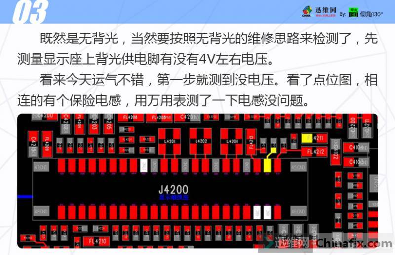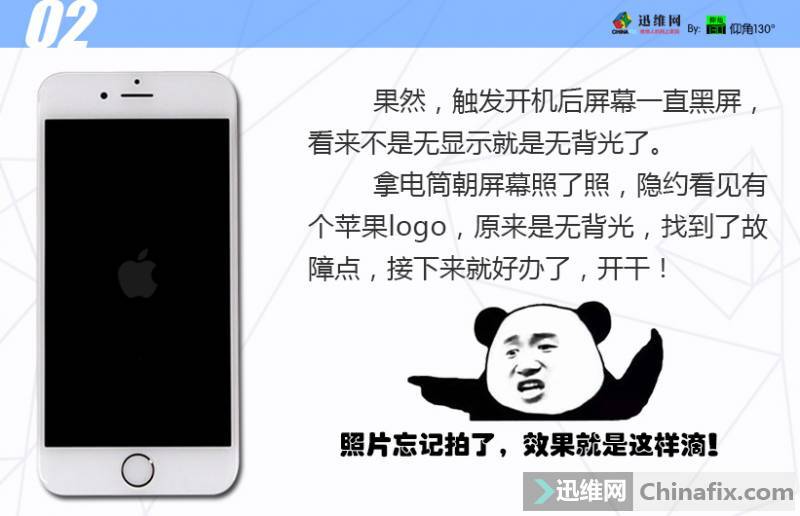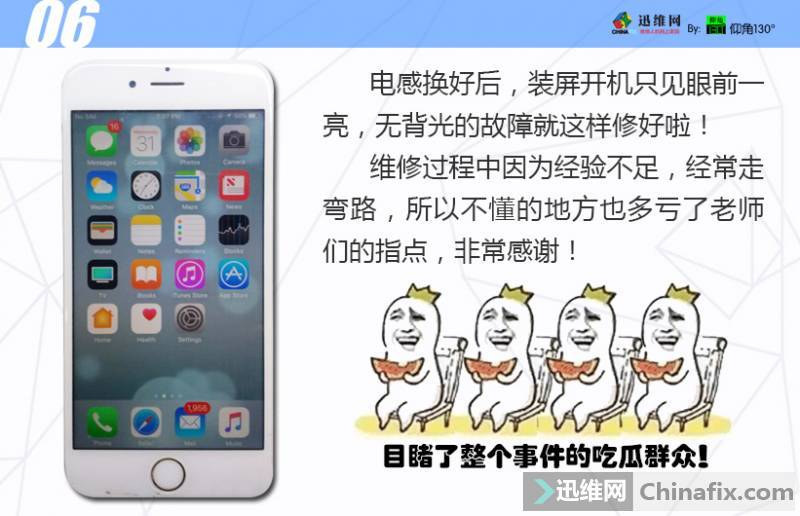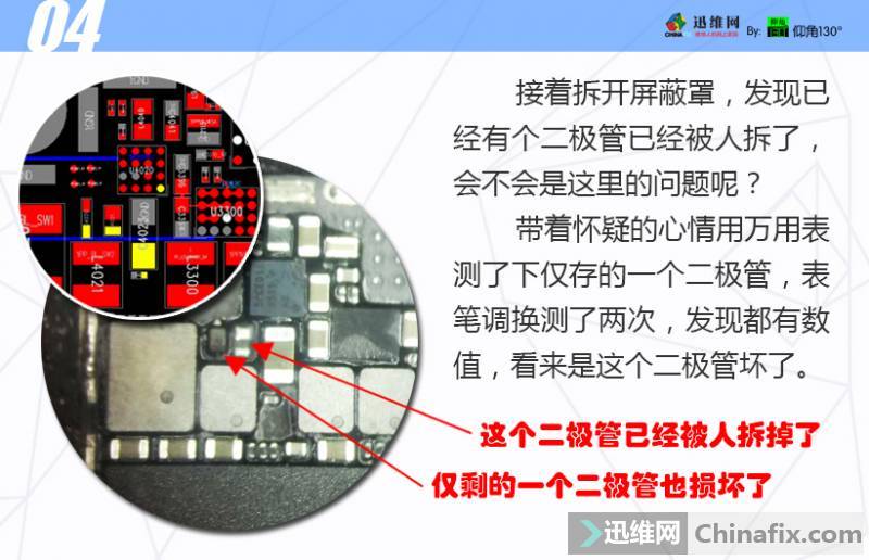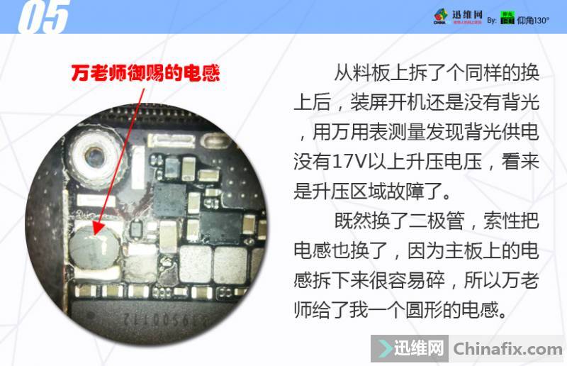 | ▼迅维学员维修iPhone6S手机黑屏,无背光故障分享,拿到故障板后检查了下没有进过水,上稳压电源看下电流情况,接电没有漏电和短路,再开机看下电流跳变也正常(6S不装屏开机电流较低,装上屏后可以上到1A左右)。运气不会这么好吧,心想第一块故障板竟然是正常的?只好再拿屏幕测试一下显示部分有没有故障了。 iPhone6S手机黑屏,无背光检修思路 图1 ▼果然,触发开机后屏幕一直黑屏,看来不是无显示就是无背光了。拿电筒朝屏幕照了照,隐约看见有个苹果logo,原来是无背光,找到了故障点,接下来就好办了,开干! iPhone6S手机黑屏,无背光检修思路 图2 ▼既然是无背光,当然要按照无背光的维修思路来检测了,先测量显示座上背光供电脚有没有4V左右电压,看来今天运气不错,第一步就测到没电压。看了点位图,相连的有个保险电感,用万用表测了一下电感没问题。 iPhone6S手机黑屏,无背光检修思路 图3 ▼接着拆开屏蔽罩,发现已经有个二极管已经被人拆了,会不会是这里的问题呢?带着怀疑的心情用万用表测了下仅存的一个二极管,表笔调换测了两次,发现都有数值,看来是这个二极管坏了。 iPhone6S手机黑屏,无背光检修思路 图4 ▼从料板上拆了个同样的换上后,装屏开机还是没有背光,用万用表测量发现背光供电没有17V以上升压电压,看来是升压区域故障了,既然换了二极管,索性把电感也换了,因为主板上的电感拆下来很容易碎,所以万老师给了我一个圆形的电感。 iPhone6S手机黑屏,无背光检修思路 图5 ▼电感换好后,装屏开机只见眼前一亮,至此,iPhone6S手机黑屏,无背光的故障修好啦!维修过程中因为经验不足,经常走弯路,所以不懂的地方也多亏了老师们的指点,非常感谢! iPhone6S手机黑屏,无背光检修思路 图6 |
