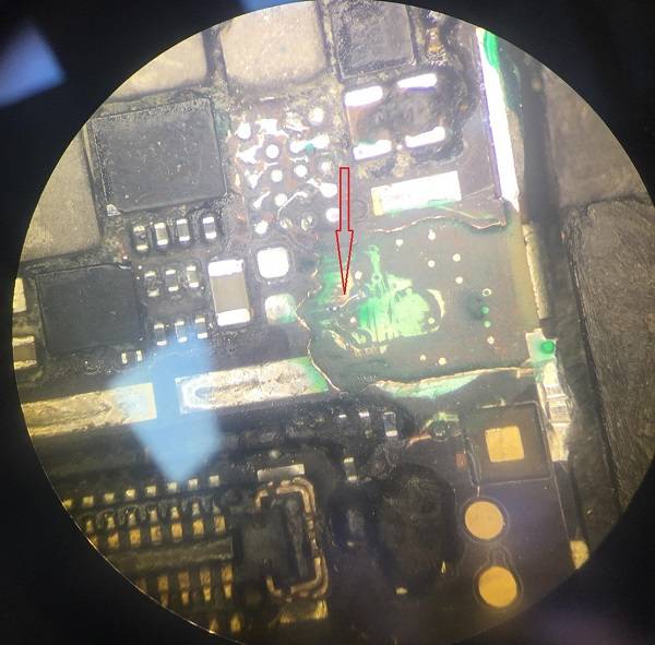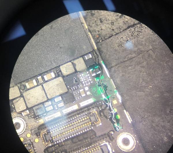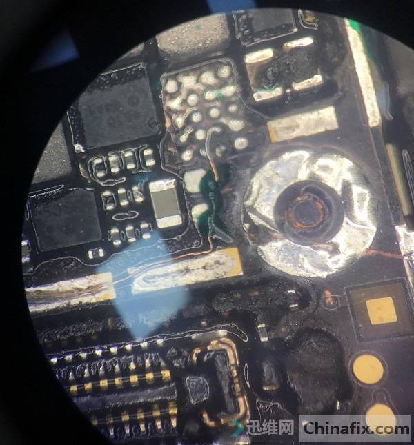 | 客户寄修收到其他维修同行的一台iPhone6 Plus,机器是被上家修过没有修好,描述的故障是手机开机不显示。拆下主板发现已经被修的很惨了。 二修iPhone6 Plus手机开机不显示故障 图1 首先上屏用可调电源触发,观察电流确实是能开机不显示。不显示首先查显示座J2019的工作条件,测量对地阻值发现显示座32脚对地短路。 二修iPhone6 Plus手机开机不显示故障 图2 这个脚是显示的正5.7V供电,这条线路上有显示芯片和FL2037、C2051、C1569。把C2051、C1569拆掉打值,依旧短路,再把显示芯片拆掉,还是短路,看来是板层短了。这种情况只能把FL2037拆掉从显示座端飞线到显示芯片A3脚。 二修iPhone6 Plus手机开机不显示故障 图3 在飞到A3脚之前,先把A3脚用绿油绝缘开,飞线到A3脚在A3脚上面做个焊盘,让显示给的供电从飞的这根线到显示座,飞完之后上芯片前,先测下显示芯片的焊盘阻值,打值发现显示芯片D3脚无穷大,正常阻值是300多。 二修iPhone6 Plus手机开机不显示故障 图4 这条线走左下螺丝孔,显微镜下观察发现螺丝孔被打个洞。 二修iPhone6 Plus手机开机不显示故障 图5 把板层刮开,确实断线了,重新补上,打值正常。 二修iPhone6 Plus手机开机不显示故障 图6 把显示的线飞到显示芯片焊盘A3脚。 二修iPhone6 Plus手机开机不显示故障 图7 飞完之后,重新装回芯片。 二修iPhone6 Plus手机开机不显示故障 图8 上屏测试,显示正常,维修到这里最终修复故障机。 二修iPhone6 Plus手机开机不显示故障 图9 iphone 不显示专题:https://www.jdwx.cn/zt/32561-1.html |
