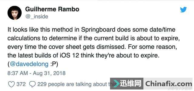 | 如果你正在运用的是 苹果iOS 12 测验版,可能今天已经被下面这条弹窗刷屏。苹果iOS 12疯狂弹窗究竟是如何维修呢?接下来我们一起通过文章了解一下。 iOS 12 出严重 BUG:苹果iOS 12疯狂弹窗究竟是如何维修? 图1 这一提示更新的弹窗,最早出现在几天前 苹果iOS 12 的第 8 个 Public Beta 版本发布时。所以当今天又一次看到它时,我还惊讶于版本更迭为何如此频繁。不过打开设置后,并没有出现所谓的新版本,而弹窗却在我的设备每次解锁后都会出现。 从网上的情况来看,被这一 Bug 困扰的用户并不在少数,大部分人同样是在每次解锁时收到提醒。此外,也有少数人声称在打开控制中心,或是每隔一段时间就会收到该通知。 国外有开发者通过逆向工程找到了这一 Bug 出现的原因。他将问题的根源锁定在了「Springboard」上。这是一个主要负责控制 苹果iOS 主屏幕的使用组件,其功能之一是在每次解锁屏屏幕后,检查当前的 苹果iOS 版本是否将要过期。而在最新的测验版系统中,这一功能出现了异常,导致系统认为当前的版本到今天已经将要过期。由于这一过程在每次解锁后都会重复一次,因此我们才会不断地接收到这一弹窗。 iOS 12 出严重 BUG:苹果iOS 12疯狂弹窗究竟是如何维修? 图2 现在,我们还不清楚苹果是否会在短期内发布更新来修复该问题。正如上文所言,苹果iOS 12 的测验已经接近尾声。从 6 月 26 日发布第一个公测版至今,苹果已经发布了 9 个 苹果iOS 12 公测版本。随着今天凌晨 秋季发布会日期的确定 ,按照惯例,在正式版之前,只剩一个「GM」版本的 苹果iOS 12 尚待发布。作为参考,去年外媒在新 iPhone 发布前 4 天,才提前拿到了 GM 版 苹果iOS 11 固件。因此,想要靠升级新版本搞定这个问题,可能还要等待一段时间。 除了等待更新,我们还可以通过调整系统时间的方式暂时搞定这一问题。在「设置 - 通用 - 日期与时间」中取消勾选「自动设置」,然后将日期更改为 8 月 30 日或更早,就可以不再收到提醒。 iOS 12 出严重 BUG:苹果iOS 12疯狂弹窗究竟是如何维修? 图3 不过,这一方式也并不完美。如果你将时间更改为到 30 日,那么明天你还需要再手动更改一次时间。除非你将日期做大幅更改,否则几乎免不了要再做二次调整。除此之外,手动调整时间还会给设备上运行的使用带来各种问题,例如: 日历的当前日期和时间会随着你的更改发生变化,但你已经设定的事件不会。举例来说,如果你在调整时间前已经设置了一个 9 月 1 号的事件,更改时间后事件会在后天发生。因此更改时间后,务必要检查日历中是否有已经设定好的日程,避免影响自己的工作和生活。 iOS 12 出严重 BUG:苹果iOS 12疯狂弹窗究竟是如何维修? 图4 提醒事项、Things 等任务管理工具的日期会发生相应的调整。其中,Things 中时间被设定为「今天」的任务在更改时间后不受影响,但其他时间的任务会产生相似日历的效果。 iOS 12 出严重 BUG:苹果iOS 12疯狂弹窗究竟是如何维修? 图5 信息、照片、微信、QQ 等使用的信息流的时间都会受到影响。 支付宝将无法进行转账、发红包或付款,微信、QQ 则不受影响。 iOS 12 出严重 BUG:苹果iOS 12疯狂弹窗究竟是如何维修? 图6 当然,如果你希望彻底远离这一 Bug,也可以选择将设备降回正式版的 苹果iOS 11。不过要注意,降级过程会将设备数据所有抹除,操作前请先确认设备在升级前是否曾进行了备份。 这一事件也给我们提了一个醒。相比开发者测验版,苹果iOS 公测版虽然要更加稳定,但也同样属于测验版系统,依然可能会存在若干问题。如果你想要尝鲜,最好还是在备用机上装载运用,并提前做好备份工作。有备无患,才能更放心地体验新功能。以上就是小编为大家来的苹果iOS 12疯狂弹窗究竟是如何维修的原因,欢迎━(*`∀´*)ノ亻!大家来家电维修技术论坛交流学习。 搜索 复制 收藏 收藏 收藏 |