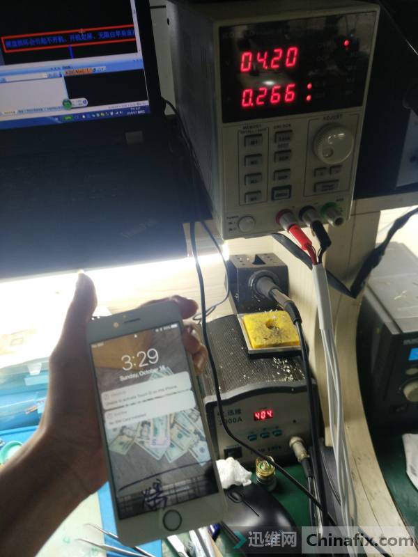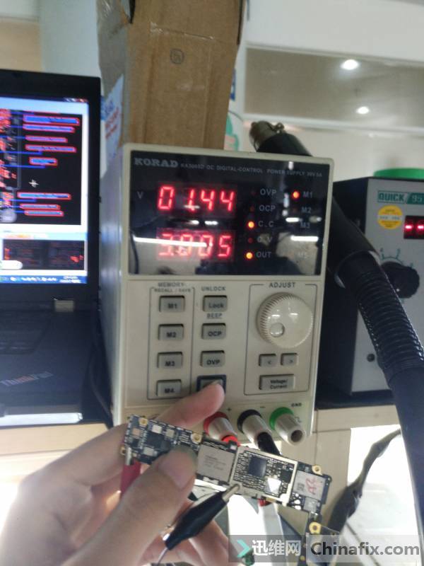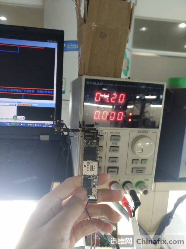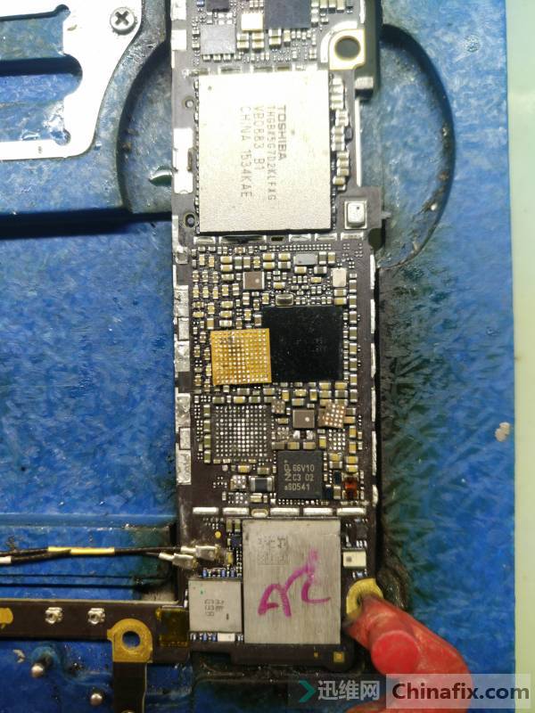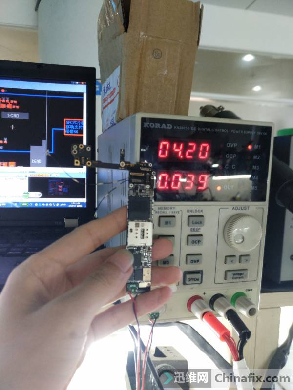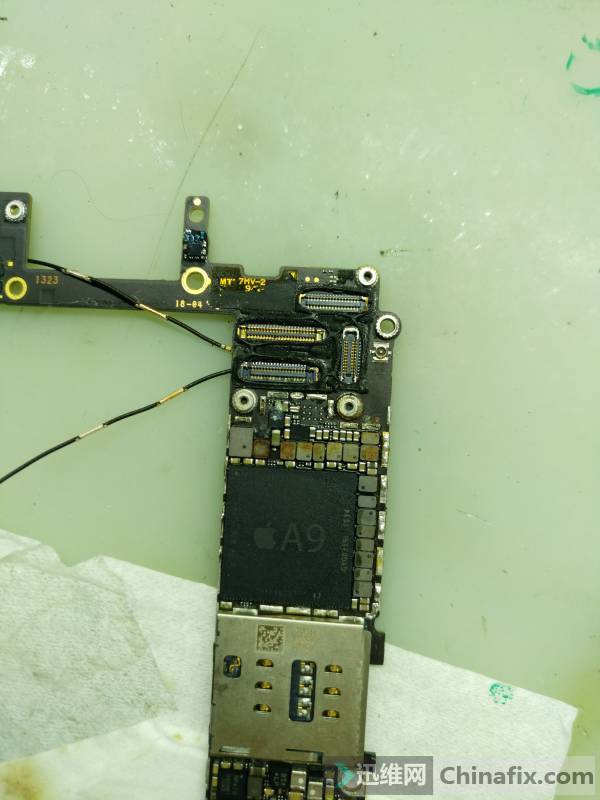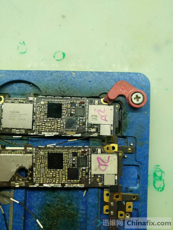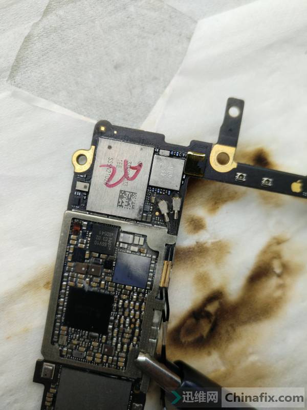 | 6S故障板一块,目测木有进水,贴纸旧旧的没撕过,看来不是二修机,加个电3A大短,手机主板出问题了。好吧!摸一下看看,Q2300发烫。注意Q2300发烫肯定不是它坏,是主供电PP_VCC_MIAN有短路。拿掉屏蔽盖在Q2300的输出端电容上面焊一根线,再接电烧机,摸一下发现大音频位置发烫。拆开看手机进水有腐蚀,还不少,先烧一下吧!C3600光荣牺牲了,扣掉它。 iPhone6S手机进水大短路检修思路 图1 iPhone6S手机进水大短路检修思路 图2 加电变成700多mA了,再摸一下,NFC供电管U5302_RF的供电电感L5303_RF发烫,应该是U5302_RF坏了,拿掉L5303_RF试变成加电漏电39mA了,思路正确。 iPhone6S手机进水大短路检修思路 图3 iPhone6S手机进水大短路检修思路 图4 接下来该解决手机进水的问题了。进水的机器,建议拆掉所有屏蔽盖仔细观察。拆开发现主要是电源这一个屏蔽盖里面进水多,一大片,背面CPU边上背光灯IC-U4020及周边有发霉腐蚀。 iPhone6S手机进水大短路检修思路 图5 iPhone6S手机进水大短路检修思路 图6 iPhone6S手机进水大短路检修思路 图7 拆完后拍照保留记号,在显微镜下仔细观察记好腐蚀的元件,换了腐蚀元件:U4040、U4000、C4001、U3500、C1300、C3603、U5302_RF、L5303_RF、U4040、C3600、C3660、FL0610、C1312、C1302。 iPhone6S手机进水大短路检修思路 图8 iPhone6S手机进水大短路检修思路 图9 换完加电已经不漏电了,按开机键直接进系统,5分钟后看待机电流22mA。22mA也有可能是软件引起的,有锁屏密码,顺手查了下有ID锁,至此,iPhone6S手机进水大短路检修思路结束。 iPhone6S手机进水大短路检修思路 图10 iPhone6S手机进水大短路检修思路 图11 |