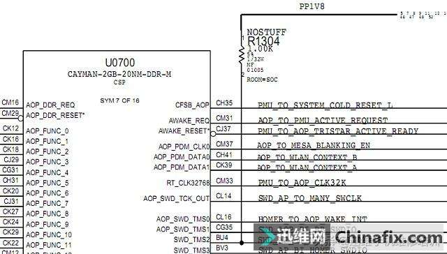 | 收到故障机客户收到其他维修同行的一台iPhone7,据描述机器之前运用正常,这是扩容后出现的问题。开机一直卡在白苹果界面,拆解接电触发200mA起跳。 问题都指向USB芯片,拆下USB芯片电流起跳恢复正常,装一个新的USB芯片,以为捡到死鱼了,但是在测验的过程中机器发热,自动关机后卡白苹果,起跳电流又变成了200mA。 拆下USB芯片起跳电流又恢复正常了,测了下焊盘的对地阻值无异常。再装一个USB芯片过了一个小时左右又变成原问题了,判断问题点应该不在USB芯片上。 把电源输出的LDO供电所有测了一遍没发现问题,忽然想到这是扩容后导致的,观察硬盘以及周边的元件,发现左边小元件有焊接过。 仔细观察发现上家在R1304焊盘上装的是个电容,打开鑫智造(私信回复图纸即可获得)对比电路图,发现这个元件压根就不存在(因为电路图中标有NOSTUFF,意思是元件未安装)。 拆掉上家安错的电容,接电触发起跳恢复正常,经测验功能一切正常,维修结束。 有爱好维修的小伙伴,点击下方“了解更多”联系我们哟! |