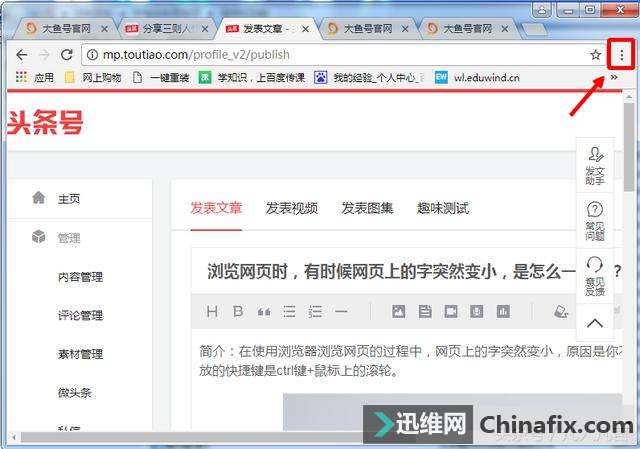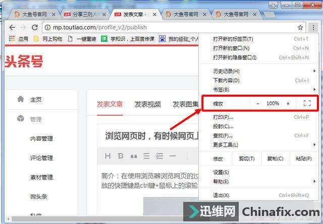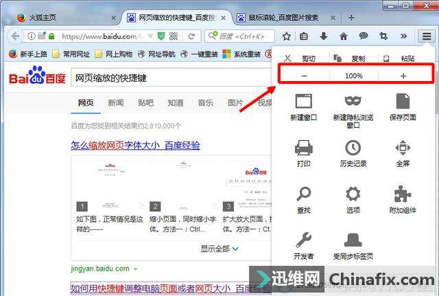 | 在运用浏览器浏览网页的过程中,网页上的字忽然变小,原因是你不小心按了缩放网页的快捷键。浏览器页面缩放的快捷键是ctrl键+鼠标上的滚轮。 当然也可以通过浏览器上的工具来调整缩放比例。 谷歌浏览器 点击三点 2.找到缩放工具 3.点+号放大,点-号缩小 火狐浏览器 点击三条横线 2.找到缩放工具 3.点+号放大,点-号缩小 注:页面默认的比例是100% |