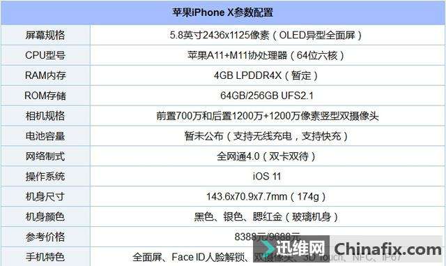 | 北京时间,9月13日凌晨(当地时间9月12日上午),苹果在美国召开新品发布会,正式发布了iPhone X、iPhone 8/8 Plus、Apple Watch 3等多款新品。其中,iPhone X打破了常规,采用全新全面屏规划,取消了Touch ID而备受关心。为了让果粉们快速了解该机,下面小编带来了完整的苹果iPhone X参数详解与真机图赏。 iPhone X iPhone X配置如何?首先来看看核心参数部分吧。由于苹果新品发布会向来神秘,部分硬件规格本次发布会中并没有公布,主要包括运行内存、电池容量两个方面,估计RAM内存为4GB左右,毕竟去年的iPhone7 Plus都上了3GB,因此iPhone X估计是4GB运行内存。此外,电池容量还未确定,不过终于加入了快充技术,并支持无线充电,也算是弥补历代iPhone不支持快充技术的短板。话不多说,以下是详细参数。 iPhone X完整参数(电脑百事网制表) 1、价格与上市时间 苹果iPhone X提供两个版本,主要是ROM储存不一样,其中64GB版国行版售价8388元,256GB版售价9688元。上市时间方面,iPhone X上市时间比iPhone 8晚,将于10月27日开放预订,11月3日正式上市。 硬件方面,iPhone X搭载了苹果当下最强的苹果A11+M11协处六核处理器,安兔兔跑分据悉超过了20万分,这意味着苹果A11处理器的性能已经显著超越了高通骁龙835,使得iPhone X(还有iPhone 8)成为现在全球跑分最高的手机,也是性能最强悍。 简约玻璃后壳 作为苹果今年最重磅的新手机,iPhone X卖点颇多,包括异型全面屏、后置双摄像头、取消指纹识别技术,运用全新Face ID面部识别、首次支持快充技术与无线充电,加之强悍性能,堪称年度机皇,但国行售价不便宜。 2、外观图赏 作为一款全屏手机,外观无疑是最大的卖点之一。iPhone X正面配备5.8英寸OLED全面屏,顶部采用“刘海”式的异型全面屏规划,中框为不锈钢金属,后壳则为玻璃,提供灰色和银色2种配色可选,后续还会推出“腮红金”新配色,是一款高颜值玻璃全屏手机。 iPhone X图赏 iPhone X外观规划相比上一代iPhone 7来说,可谓有了颠覆性的改变,主要表现在以下4个方面: 1、上一代iPhone 7/6s/6/5均为金属机身规划,而iPhone X则采用了玻璃,再次回归到iPhone 4玻璃材质; 2、iPhone X全面屏规划,这是历代iPhone中,首款采用全面屏规划的机型; iPhone X正面图片 3、iPhone X取消了Touch ID正面指纹Home按键,Touch ID被替换为新的Face ID面部识别功能。Face ID依赖于新的True Depth相机系统,该功能甚至黑暗中可以解锁您的iPhone,iPhone X配备了最新的A11仿生芯片,带有一个特殊的神经元引擎,可以帮助人脸识别技术更加出色。 4、iPhone X背面双摄规划,采用竖型排列,而上一代iPhone 7 Plus则为平行排列。此外,玻璃机身也没有了背面突兀的天线条,背面也显得更为简约。只不过,玻璃材质在耐刮性、耐水性方面不如金属,相对更容易沾指纹一些。 iPhone X背面图片(银色) iPhone X灰色图赏 最后值得一提的是,iPhone X虽然是5.8英寸大屏规划,但由于采用全面屏规划,其机身尺寸比上一代5.5英寸iPhone7 Plus还要小,因此单手操作与便携性显得更好。 以上就是iPhone X图赏部分,从外观来看,该机在外观规划上还是非常简约时尚的,颜值可以说是历代iPhone中最漂亮的。 |