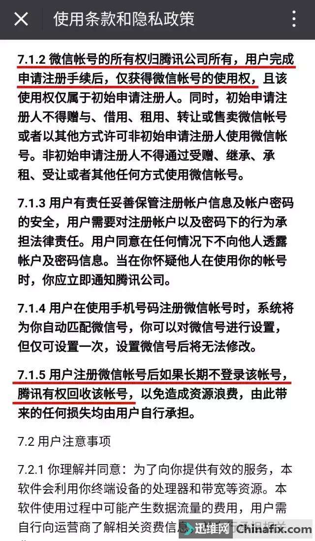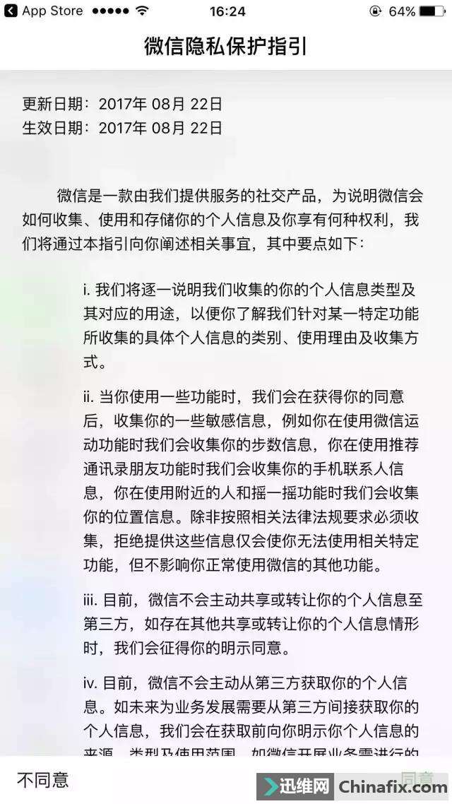 | 总有人说,微信的更新总是光明正大的来,新功能却是偷偷摸摸的加。而这次微信新版本的变化来得有点猛~ 所有进入苹果iOS 6.5.16 、Android 6.5.14最新版本微信的用户,在首次登入微信时,会收到一条必读消息《微信隐私保护指引》。 点击“了解更多”可阅读更详细的内容: 根据第一项“我们收集的信息”可知,微信要求用户在注册账户是必须提交手机号码,用于满足实名制要求。 继续往下翻,此协议还明示了微信储存信息的种类、运用方式、安全策略,并告知了用户权利与访问、删除个人信息的方式。 简言之,就是微信在一经用户本人同意之后,就会收集用户的一些敏感信息,比如微信步数、收集联系人信息、在运用附近的人和摇一摇时的位置信息等。 做好赤诚相见的准备了吗?如果想要正常运用微信就必须点击做末尾的“同意”,如果你要证明自己“有骨气”,点击不一样意?那慢走不送~ 不过大家也别愤愤不平,你的微信都不是你的,而是腾讯的。《腾讯微信软件许可及服务协议》中已经明确说明了: 微信账号的所有权归腾讯所有,用户仅有运用权。 如果长期没有登录微信,腾讯有权收回该账号,并且损失由用户承担。 所以,也别纠结“我死后微信如何维修”的问题了。 当然,更不用担心这些隐私被收集后落入不法分子手中。在隐私协议中明确表示了,未经许可,微信不会主动共享或转让你的信息给第三方,也不会主动从第三方获得你的个人信息。 另外,在这次的更新中还有一个藏得比较深的重要功能。这是微信新赋予你的一个权力:可管理通过微信授权过的信息。 具体操作如下:【我】 - 【设置】 - 【隐私】- 【授权管理】 该功能意味着在此版本的微信中,即可查看和关闭第三方服务的授权问题。说得再通俗一点就是: 在很多第三方服务中,比如《王者荣耀》等,我们可以直接通过QQ、微信账号授权登陆,免去注册的麻烦,但这可能会带来隐私和安全方面的问题,尤其是授权服务太多,自己也记不清到底在哪儿用过,被垃圾信息骚扰也找不到源头。 这个时候,如果关闭相关授权,就能将QQ或微信等账号从这些使用中脱离出来。 实际上,至9月14日期,用户在登录微信、微博、淘宝、高德地图、百度地图等客户端时,都将收到平台推送的个人信息保护协议,同意后才能运用。这也算是响应中央网信办、工信部、公安部、国家标准委等四部门贯彻落实网络安全法对个人信息保护的相关要求的政策。 这次的更新还有一个小细节:语音转化成文字更贴心 新版微信中,将语音转化成文字时,不再是之前的全屏模式,而是变成下图这种更贴心的形式。另外,退出聊天时,文字又会消失哦! 你还怕收到语音消息吗?小意思! 最后,以上这些新功能现在都是苹果iOS版微信用户先吃螃蟹,安卓用户再等等吧,大家都“逃不掉”的,新版就在路上。 |