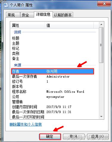 | 简介:Word文档的默认作者是administer,能否改成作者自己的姓名。 工具:Word2010 方式一 1.点击【文件】 2.点击【选项】 3.点击【常规】 4.在用户名中输入作者的姓名,如:张光明 5.点击【确定】 方式二 1.右击word文档 2.点击【属性】 3.点击【详细信息】 4.在作者输入框中输入作者姓名,如:张光明 注:Excel和ppt中可以用相似的方式修改作者信息 注:第一种方式是根本的方式,以后创建的文档作者都是修改后的名字 注:第二种方式是对单个文档的作者进行的修改 |
