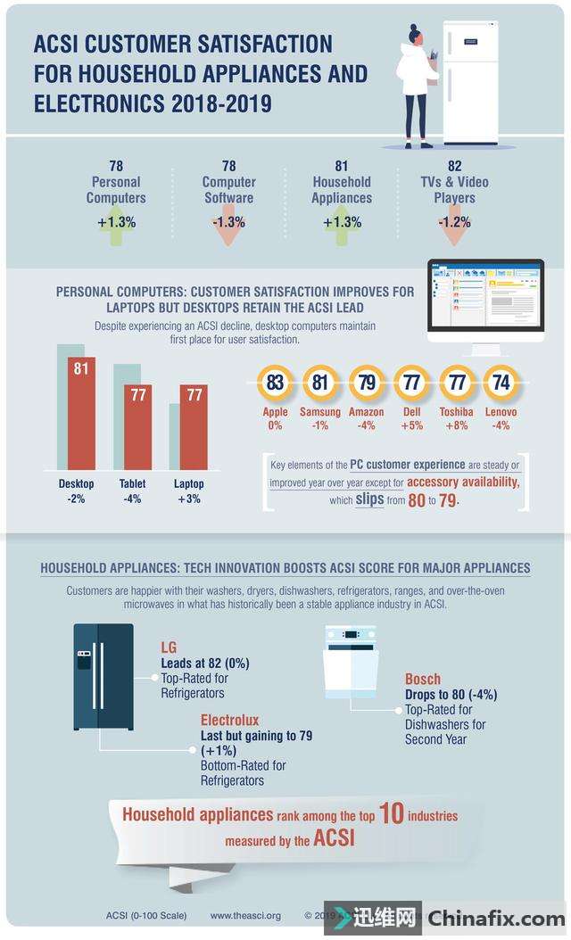 | 「美国顾客满意度指数」今天发布了 2018-2019 年度美国个人电脑和家用电器市场的满意度调查研究,数据显示苹果旗下的 Mac 和 iPad 再次在 PC 和平板电脑品类中获得总分第一的成绩,第二名和第三名的三星和亚马逊和去年的成绩相比均有所下降。 具体来看,Mac 和 iPad 系列产品在 PC 和平板电脑类别中取得了与去年一样的 83 分,三星以 81 分紧随其后。 与此同时,亚马逊今年下跌了 4%,但以 79 分的成绩排名第三,惠普、宏碁、戴尔和东芝得分均为 77,达到了近几年来的最高点,具体的数据可以查看下面这张图表。 |