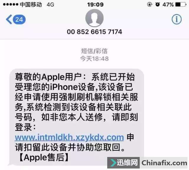 | iPhone 丢了,宝宝们一定心急如焚,接下一天甚至几天的心情都会沉浸在忧郁之中...... 不过,小编要告诉你,心痛之余,千万别急中乱智,那些捡到你爱机并不打算归还的“坏人”,正急着套取你的奥秘呢!比如你会收到下面这样的短信: 急着找回手机的宝宝第一时间就相信了吧,小乐在此强调,千万别急!别信!别点!曾经有个妹纸就当真了,结果输完密码后就傻眼,本来还能追踪的设备彻底歇菜了...... 其实,iPhone 遗失后,只要收到和以上信息相似的短信,千万不要点!想知道如何找回遗失的 iPhone,点击这里就好啦! 温馨提示 夏季轻装简行,出入记得把手机放好哦~ |