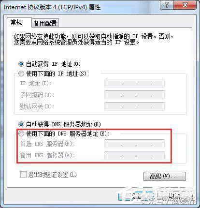 | 在平时工作之余,我们常常会浏览网页,可是每次浏览网页的时候总是会提示无法显示此网页、找不到服务器或DNS错误,那么当你遇到Win7找不到服务器或DNS错误如何维修,不知道的朋友赶紧看看可可整理的以下搞定方式吧! 方式/步骤: 1、网站问题:当你发现其它网站可以打开的时候,光就这个网站打不开时,可能是因为域名服务器发生问题或网站链接被删了,也可能是网络服务器的线路发生意外堵塞,从而导致少部分地区的用户无法链接。 搞定办法:这个问题主要是您所要访问的网站的问题,此时我们刷新网页,多等会就行了。 2、病毒侵入:电脑中病毒了,就是有可能被DNS劫持了,像一些首页被被动或主动地篡改了,导致一部分网页打不开或正在进行跳转别的网站等。 搞定办法:运用你电脑上已经下载好了的正版杀毒软件对你的电脑全盘扫描,看下有没有病毒,没有病毒且杀毒后再次访问网页可以打开,很可能是因为病毒原因所引起的。 3、网络问题:网络问题是我们常遇到的引起DNS错误的因故,像我们经常因为在浏览网页时没网络就会出现像这样的的提示。 搞定办法:检查下网络有没有断掉。 4、DNS配置错误:上网一般都是采用电脑里面已经设置好的自动获得DNS,但特殊情况还是需要自行设置下的。要知道DNS输入错误导致网页打不开是正常的,比我们经常遇到QQ可以上但网页打不开。这时候我们就得正确配置DNS,具体方式请看下面: (1)开始→控制面板→-网络和共享中心。 (2)点击更改适配器设置→右击本地连接选择属性→Internet 协议4(TCP/IPv4)属性。 (3)一般显示的都是“自动获得DNS服务器地址”但是当DNS出现错误的话,我们就须要简单得设置下。 (4)直接设置好了连下网试试就行了。 以上就是Win7找不到服务器或DNS错误的搞定方式了,方式很简单,我们首先要先判断是不是中毒了或者网络问题,如果不是的话,就去设置一下DNS就可以了。 |